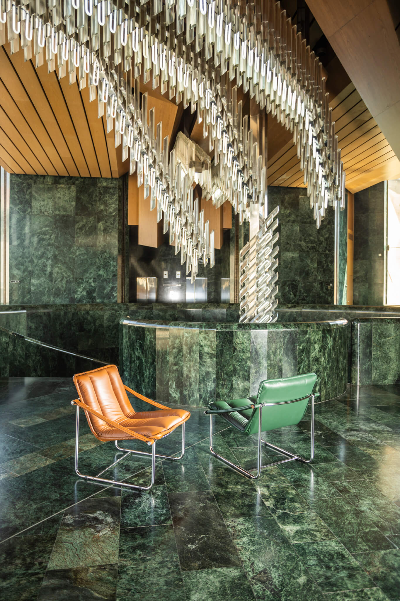 Stejně působivý byl i Pragerův plán interiéru stavby. Hned při vstupu do hlavní budovy návštěvníky přivítá impozantní skleněný lustr navržený Pavlem Hlavou a Jaroslavem Štursou, který visí od čtvrtého patra až do přízemí a prochází středem velkého točitého schodiště. Lustr je tvořen pětibokými hranoly, které po nasvícení neonovými trubicemi uvnitř vrhají spektrum barev.