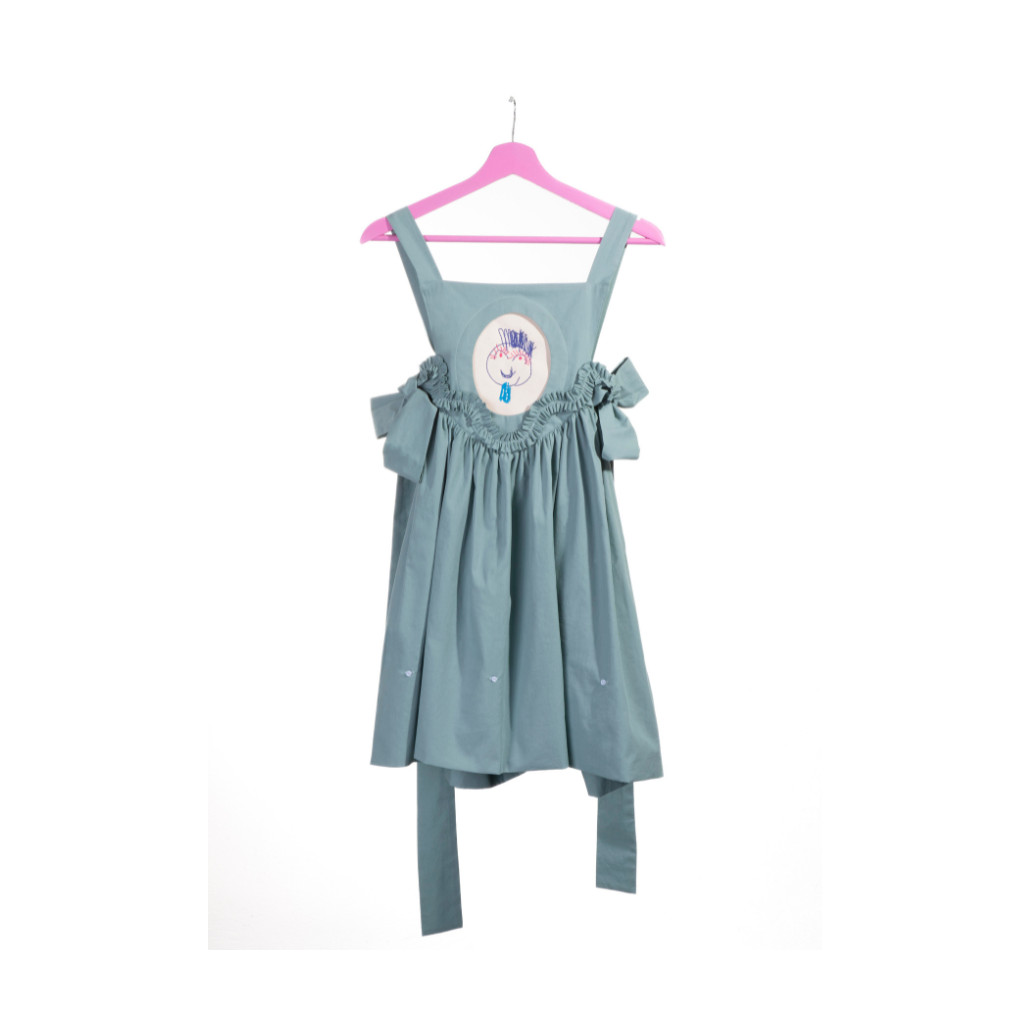 Dětské, rostoucí, modré šaty s vyjímatelnou výšivkou, jejíž motiv si dítě navrhne samo, vznikly jako spolupráce oděvní designerky Kateřiny Plamitzerové a grafického designera Františka Kasta (Kirka studio).