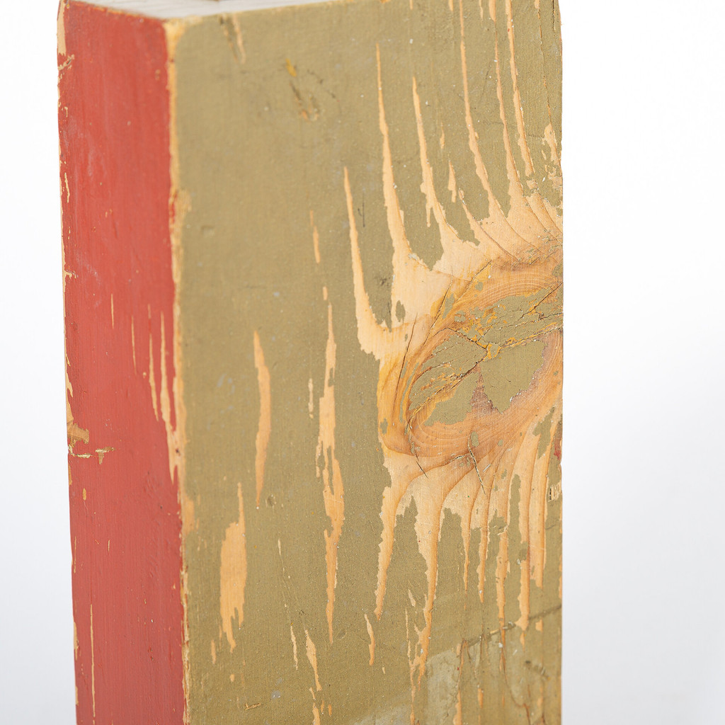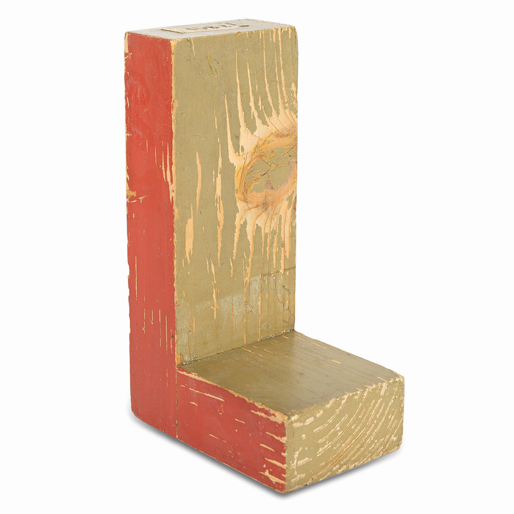 Dřevěné písmeno, které sloužilo jako pomůcka pro děti ve škole. Písmeno je z jedné strany natřeno žlutou barvou a z druhé červenou. Díky stáří a používání jsou barvy vybledlé a vytváří tak charakteristický vzhled. Písmeno je ponecháno v původním stavu s autentickou patinou a může být vynikající dekorací pro sběratele, pro školy nebo pro dětské pokoje.