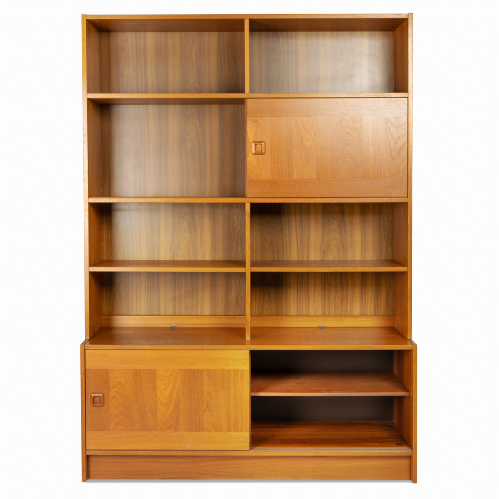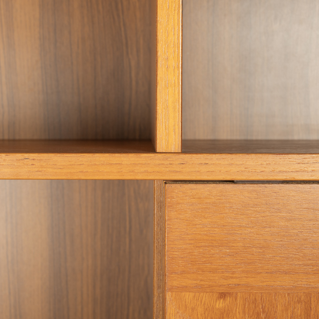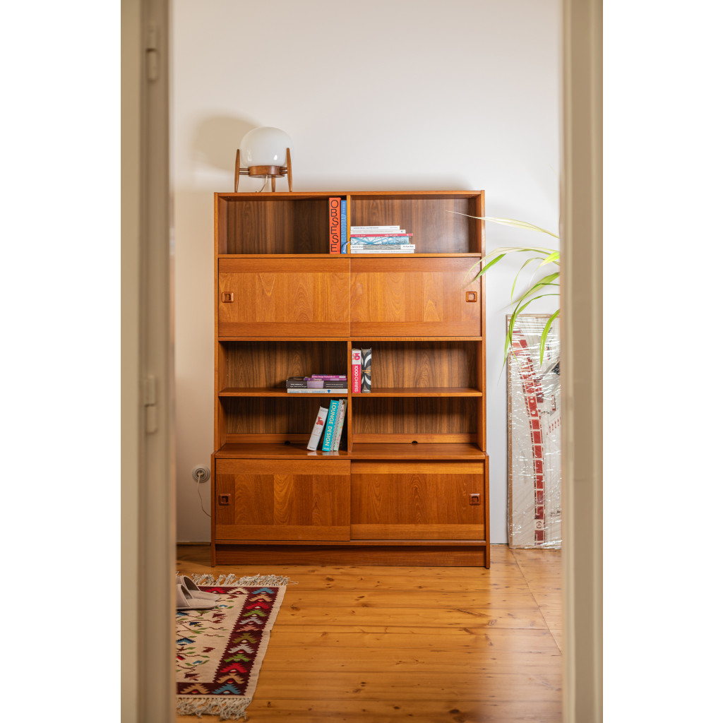 Dřevěný policový systém z šedesátých let z produkce dánské firmy Domino Møbler, jedním z významných výrobců dánského modernistického nábytku, který kombinuje minimalistické linie s přírodním dřevem. Knihovna je vyrobena z dřevotřísky, které je upraveno dýhou z teakového dřeva. Policový systém kombinuje otevřené police s úložnými prostory s posuvnými dvířky. Nábytek je ve výborném původním stavu.