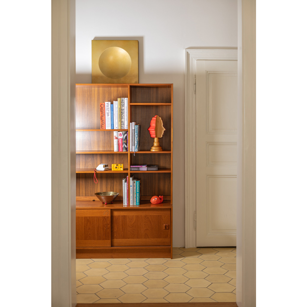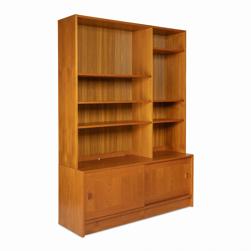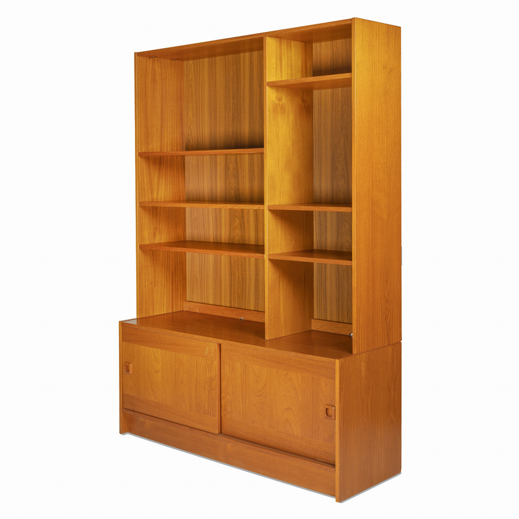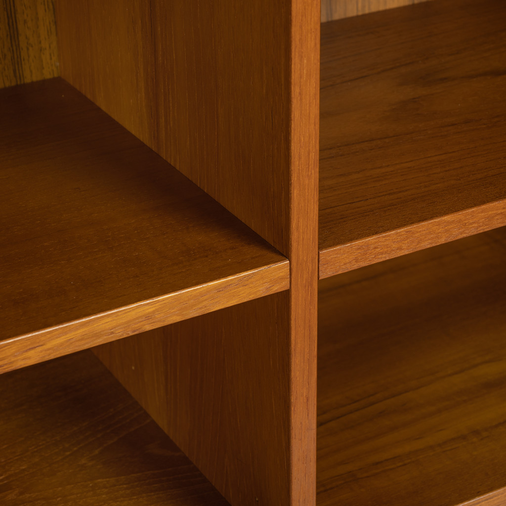 Dřevěný policový systém z šedesátých let z produkce dánské firmy Domino Møbler, jedním z významných výrobců dánského modernistického nábytku, který kombinuje minimalistické linie s přírodním dřevem. Knihovna je vyrobena z dřevotřísky, které je upraveno dýhou z teakového dřeva. Policový systém kombinuje otevřené police s úložnými prostory s posuvnými dvířky. Nábytek je ve výborném původním stavu.