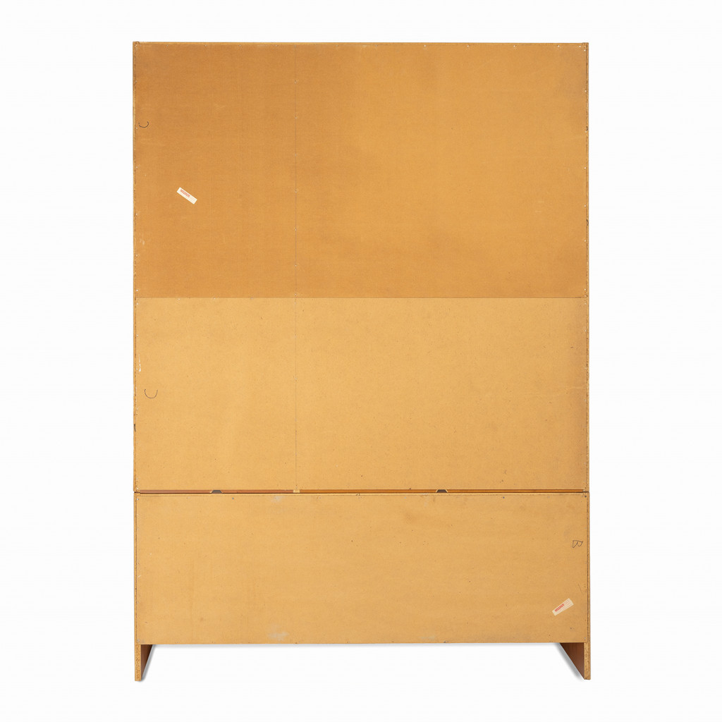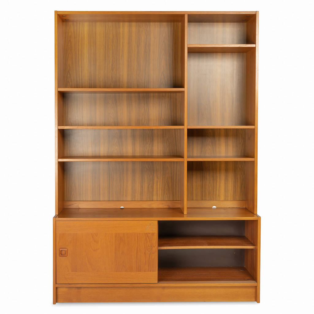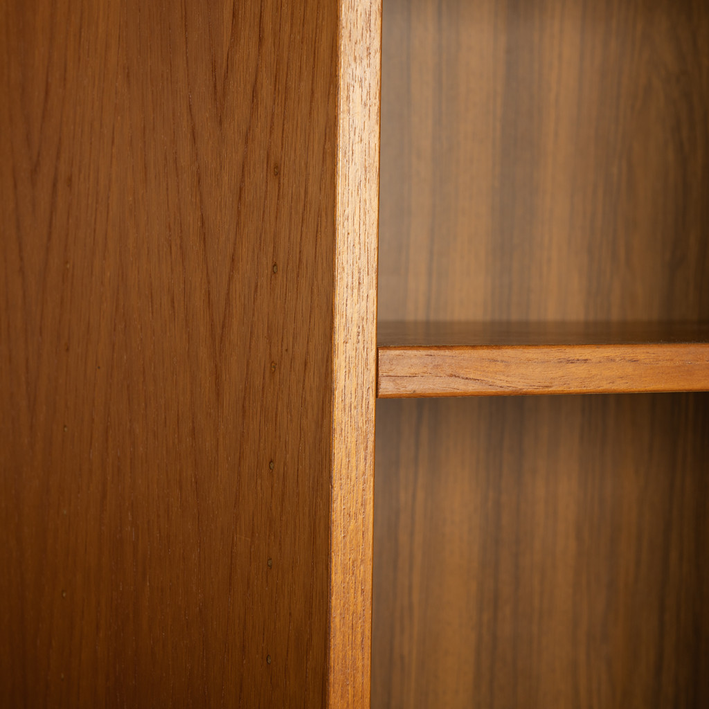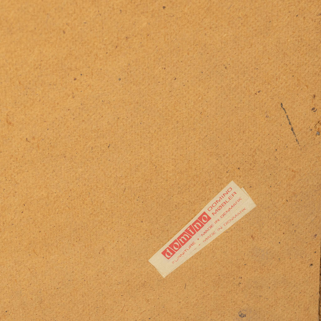 Dřevěný policový systém z šedesátých let z produkce dánské firmy Domino Møbler, jedním z významných výrobců dánského modernistického nábytku, který kombinuje minimalistické linie s přírodním dřevem. Knihovna je vyrobena z dřevotřísky, které je upraveno dýhou z teakového dřeva. Policový systém kombinuje otevřené police s úložnými prostory s posuvnými dvířky. Nábytek je ve výborném původním stavu.