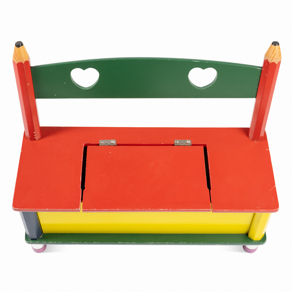 The low bench with built-in storage has legs that resemble the rubber ends of pencils. The backrest has pencils on both sides. The centre of the bench has a hidden storage compartment for toys. This bench has been thoroughly cleaned and is in its original condition.
