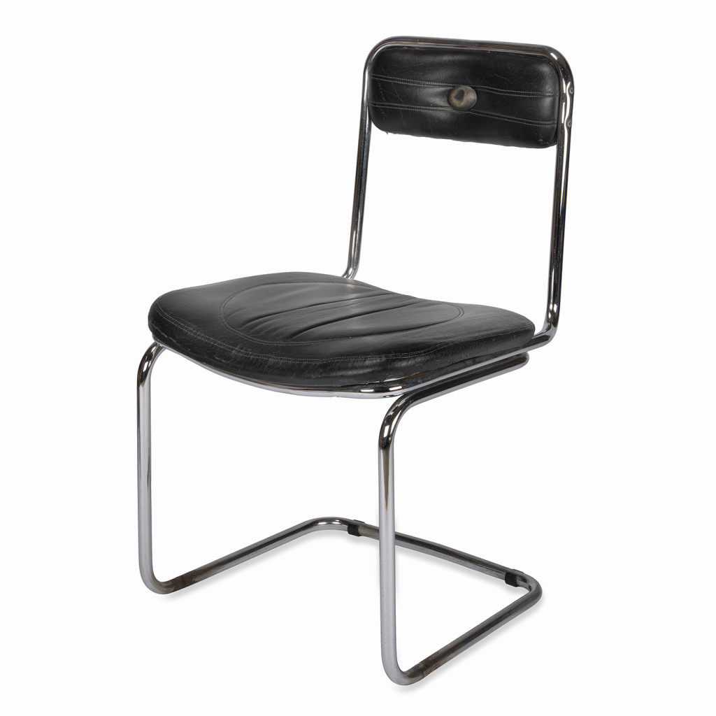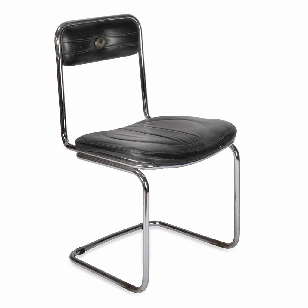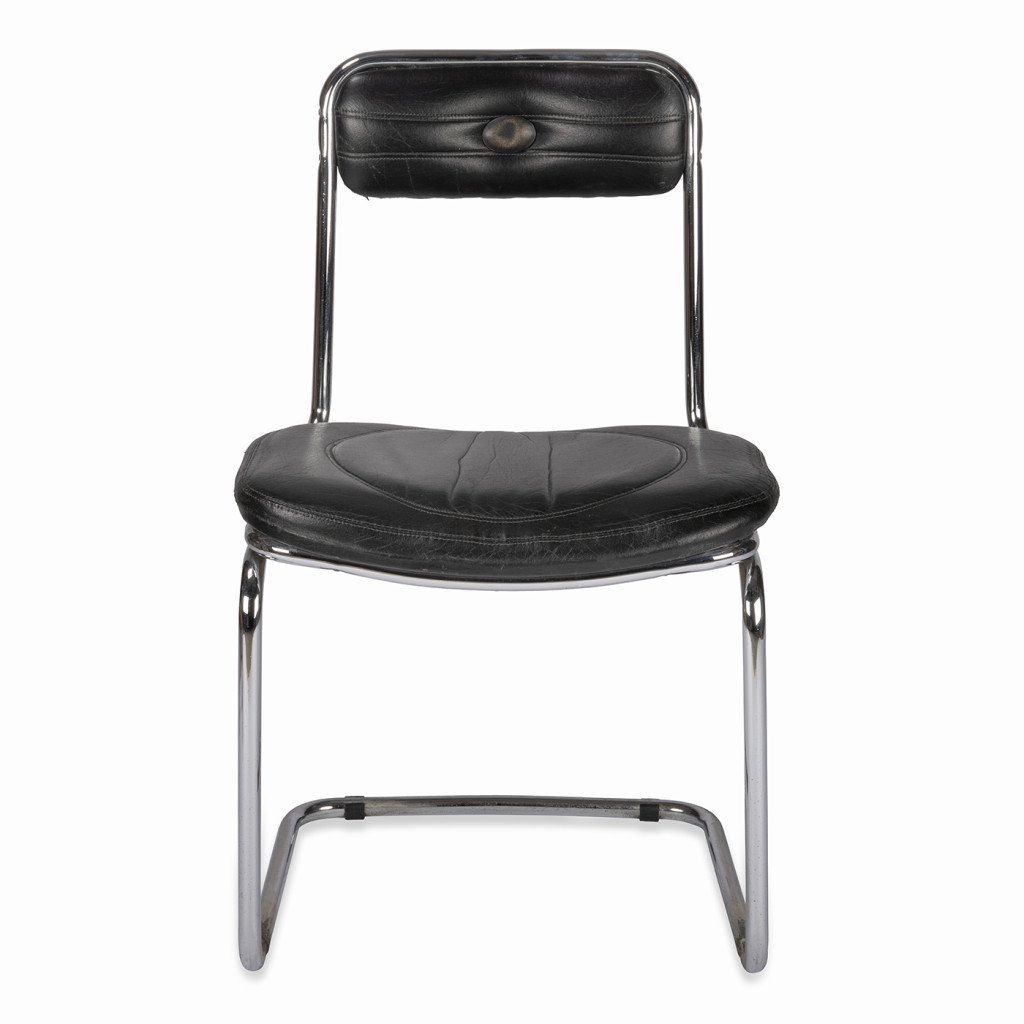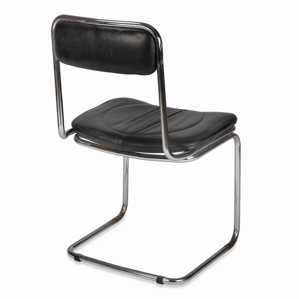 Tube chair with chrome steel base and seat and backrest made of soft black leatherette, decorated with interesting geometric stitching.