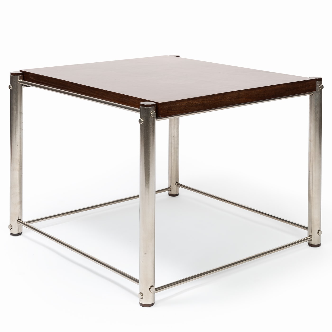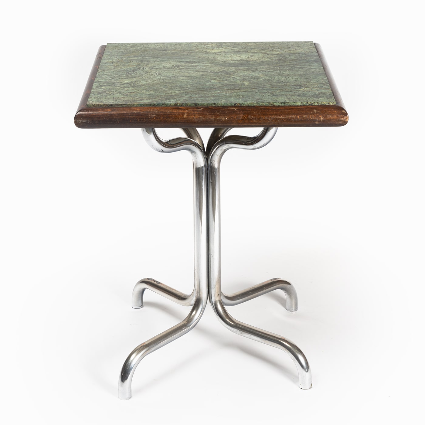A table from the bar of the original Kamyšin Hotel in Opava, built between 1984 and 1985. The table has a chromium-plated metal base made of bent tubes, the table top is made of green natural stone set in solid wood stained mahogany. The table is in good condition with some light scratches on the wood of the table top.