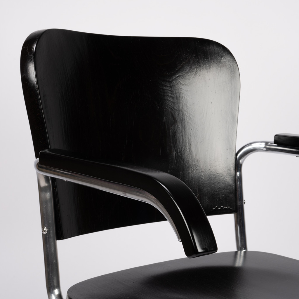 The chair has a bent tubular chrome plated steel structure which has been thoroughly cleaned and has only minor scuffs. The wooden parts are made from a combination of solid beech and plywood with a black stained finish.