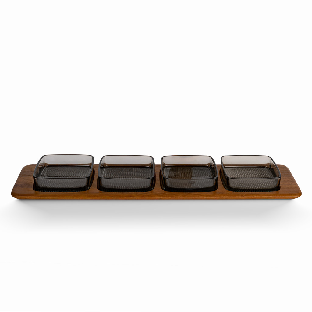 Serving bowls made by the Danish company Digsmed in the 1960s. The glass bowls are set on a teak tray. The set is in excellent condition. The wood has been cleaned and varnished with natural wood oil.