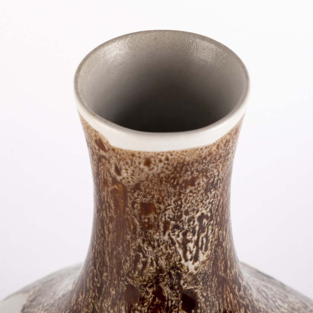A ceramic vase made by the Czech company Ditmar Urbach that was established by Rudolf Ditmar in Znojmo in 1878 and later merged with the company owned by Urbach brothers. The vase was manufactured in the nineties. It has a round, spheric shape with a narrow neck. It is glazed with a matte white colour, with brown and white speckled glaze running down from the neck. The vase is in perfect original condition.