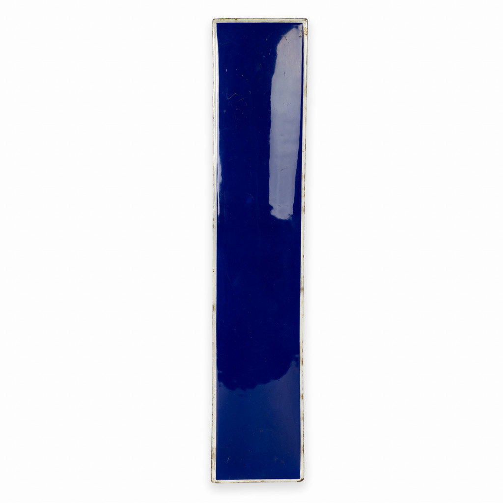 Enamelled letter from the original sign in a simple font. The front of the letter is slightly curved to give a plastic effect and is painted dark blue with a white outline. The letter is in its original condition with an authentic patina. The varnish is damaged in places. The original mounting on the other side is damaged.