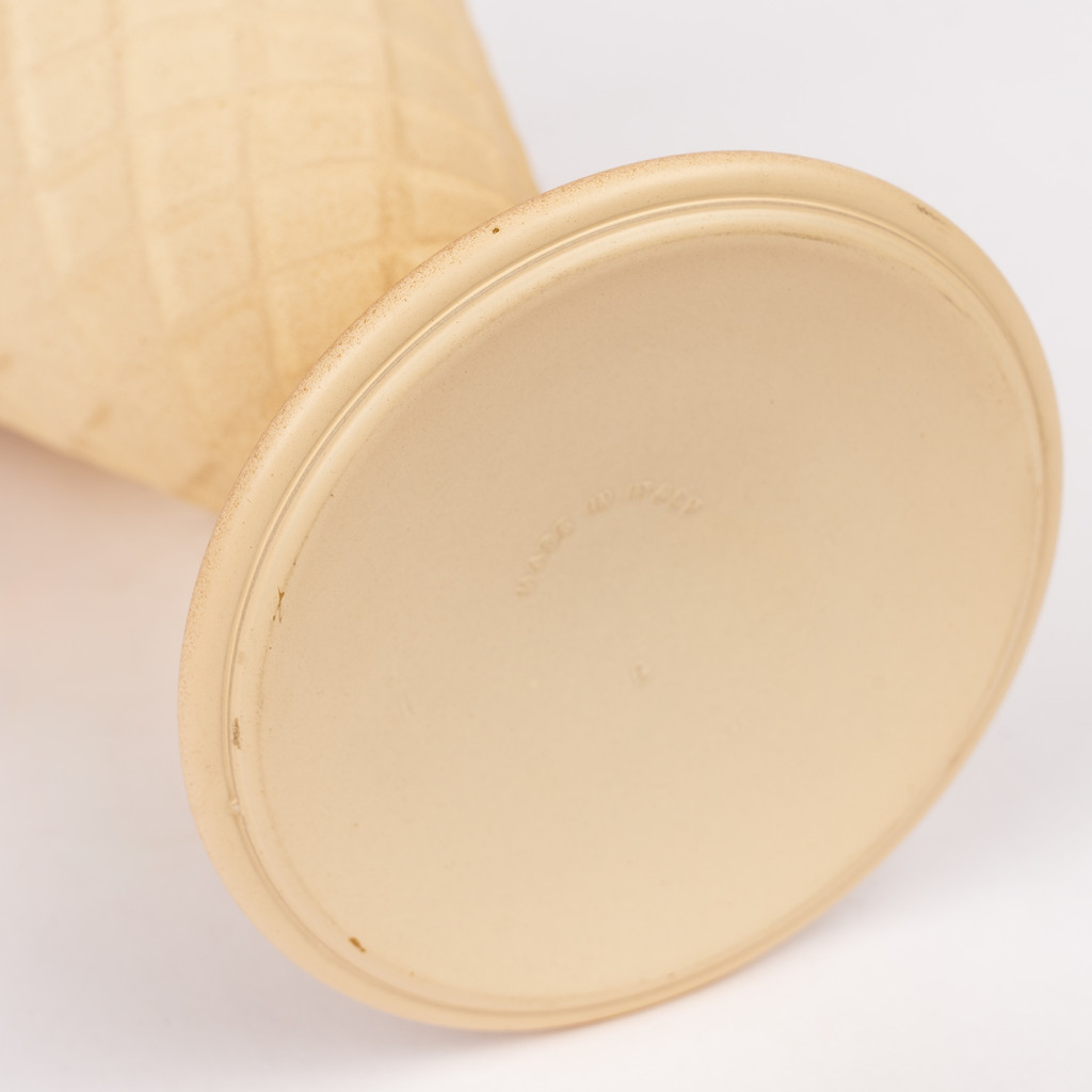 A glass ice cream bowl made by the Italian company Bormioli Rocco in the 1970s. The glass has a smooth glossy finish on the inside, the outer surface is moulded into the texture of a waffle ice cream cone with a matt coloured finish. The bowl is in good original condition.