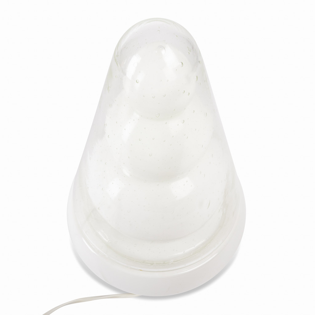 Atypical table lamp made of several layers of glass. The shaped inner part in frosted glass is covered by a rounded needle in clear glass with sealed bubbles. When lit, the frosted glass creates a pleasant diffused light, while the shape of the inner part stands out. The lamp is fully functional and has been left in its original condition.