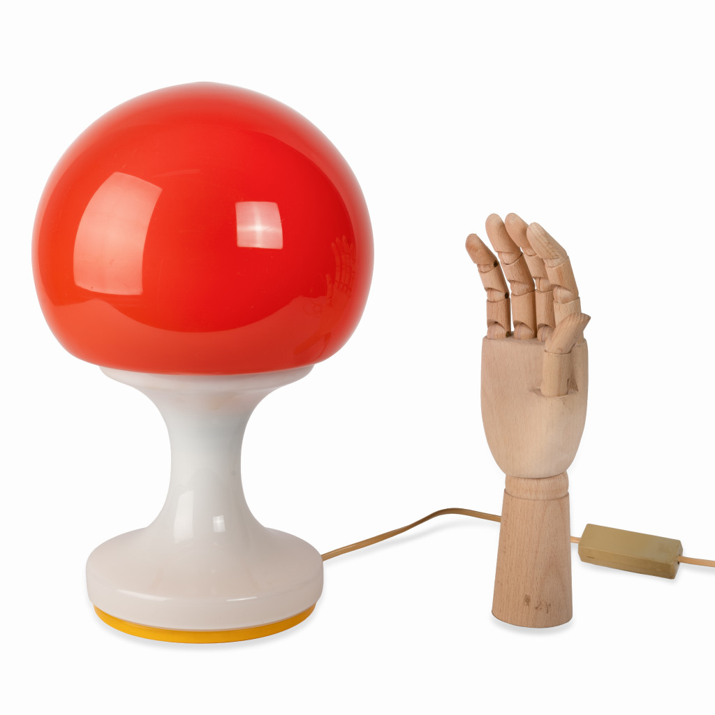 Glass table lamp, probably designed in the 1970s by Štěpán Tabery for the company Osvětlovací sklo Valašské Meziříčí. The lamp was designed in the context of the Space Age style of the time, which brought rounded futuristic lines to the aesthetics of applied design.