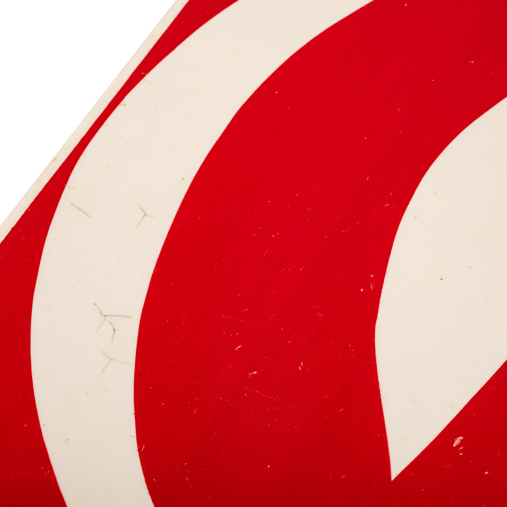Wall sign from a hot dog shop. The sign is made of plastic with a simple picture of hot dogs. The colour is scratched in some places. There is a small nail hole in each corner to attach it to the wall.