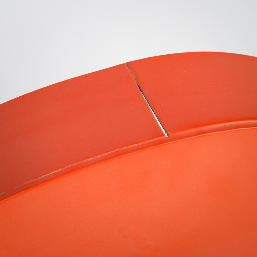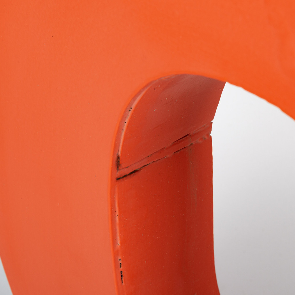 A metal letter originally from a street advertisement. The letter has a hollow, welded body, with a fairly deep profile, giving it a somewhat plastic appearance when installed on a façade. The paint is damaged in some places.