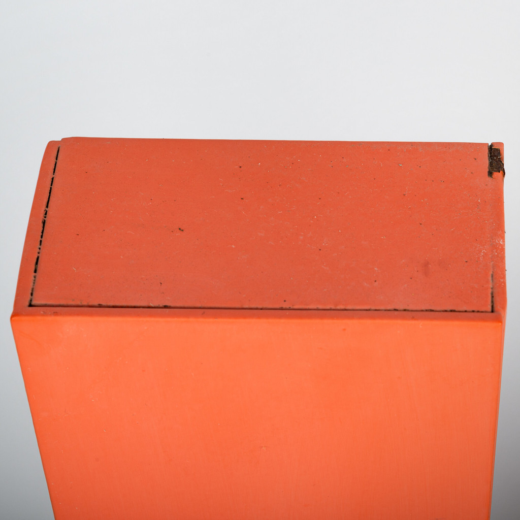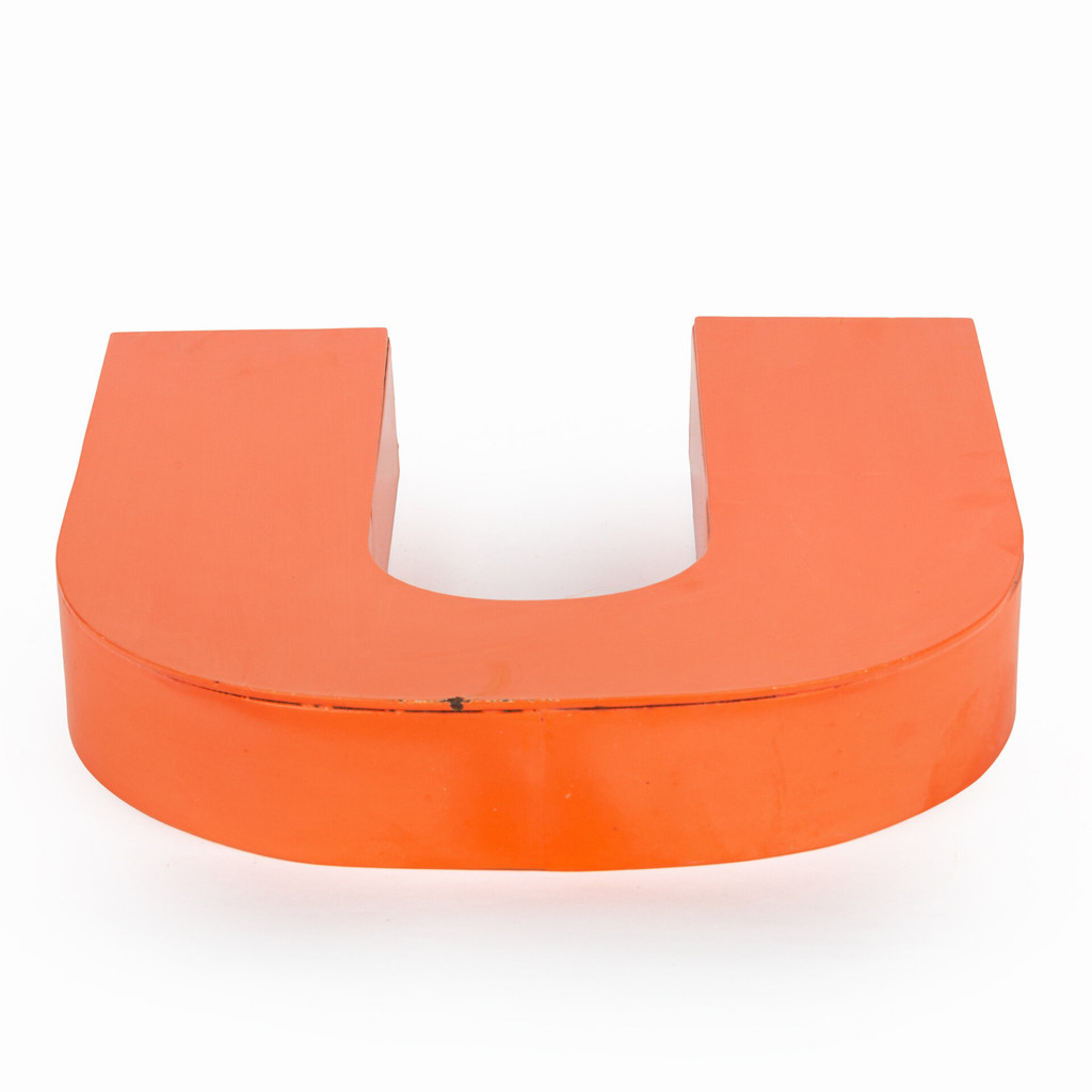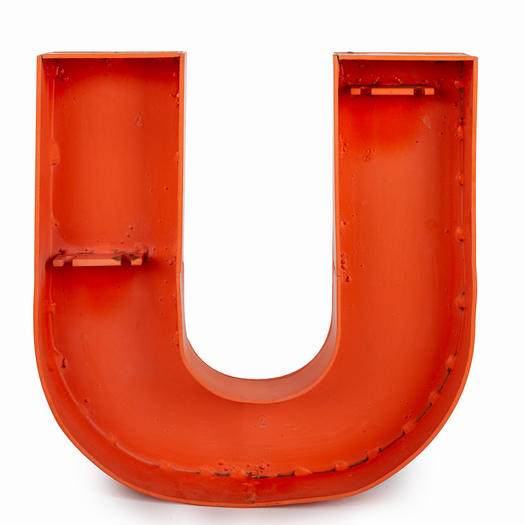 A metal letter originally from a street advertisement. The letter has a hollow, welded body, with a fairly deep profile, giving it a somewhat plastic appearance when installed on a façade. The paint is damaged in some places.