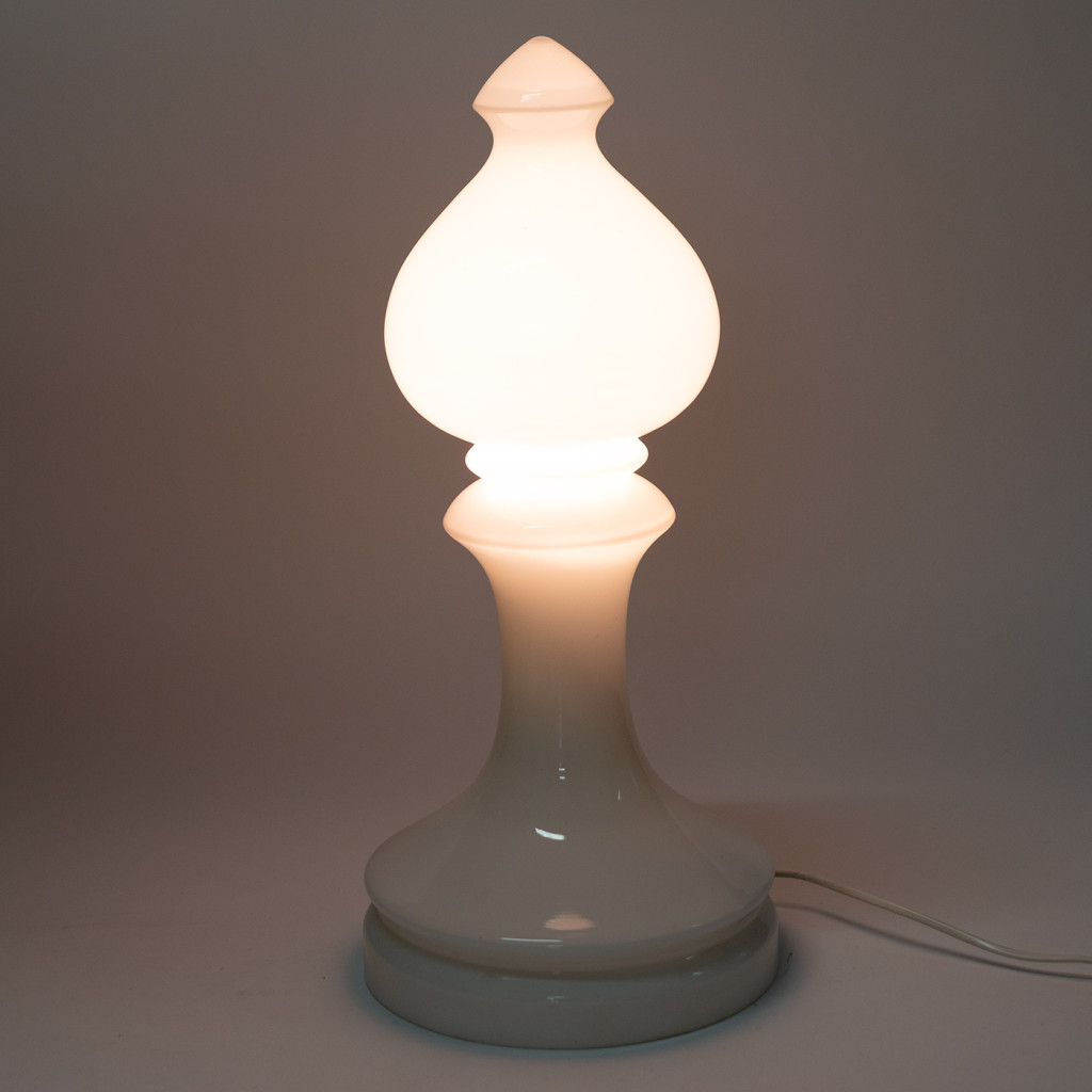 A glass lamp called Bishop designed by a Czech artist and designer Ivan Jakeš. Ivan Jakeš worked many years for a national enterprise Lighting factory (in Czech called Osvětlovací sklo) in Valašské Meziříčí. He produced tens of designs working for this company, but his chess pieces designed in 1970 are probably his most famous works. While the white being the classic colour for them, they were produced in many bright colours and were exported abroad. The Bishop lamp is made of three layers of white opaque glass, when lit the upper part glows with pleasantly warm light. The lamp is fully functional, in a good original condition.