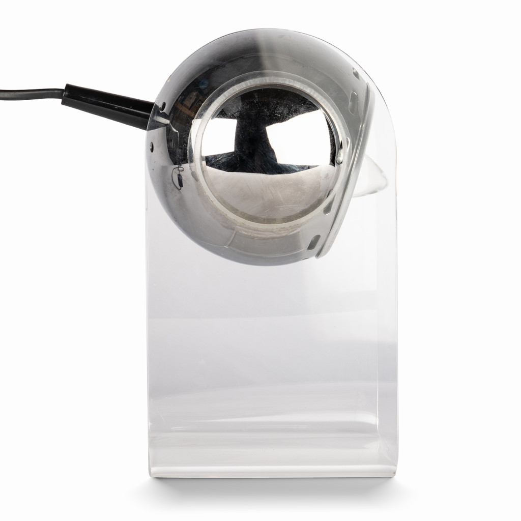 The lamp is made up of a transparent Plexiglas structure and an adjustable shade made of chrome-plated steel and plastic. The lamp is lit by a single E14 bulb and is in great original condition.