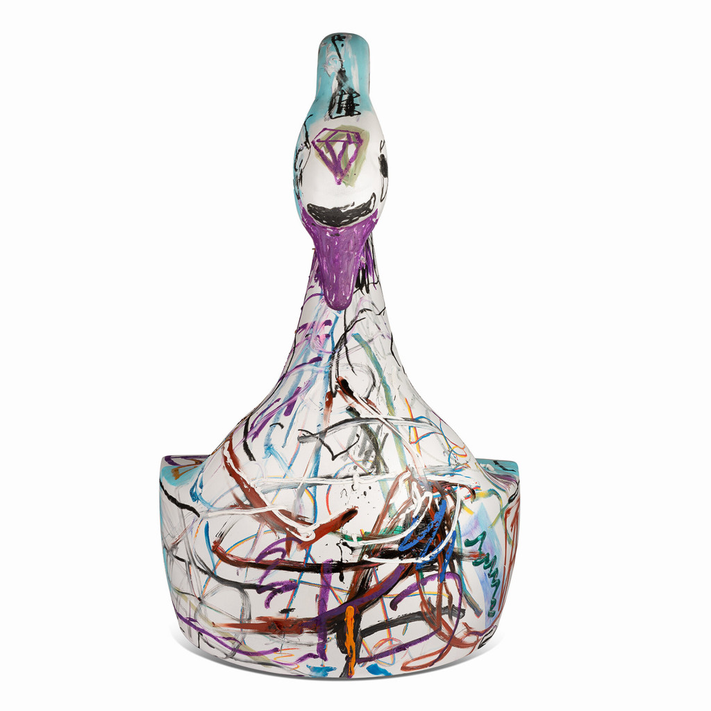 The “Trophy” swan is part of the Swans project, which was created as a tribute to director Věra Chytilová’s film The Inheritance, or Fuckoffguysgoodday. To celebrate the 30th anniversary of the film, we approached three artists and designers to create artworks out of one of its iconic symbols: a full-sized carousel swan. The weight of the swan is 25,5 kg.