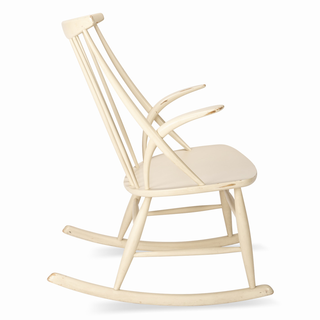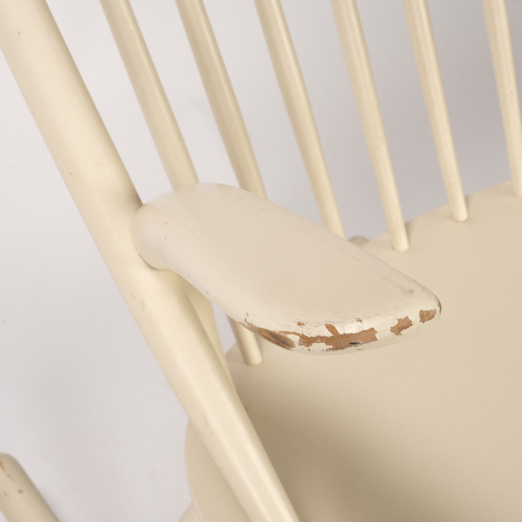 Rocking chair made in Finland in the 1960s. The chair was designed by Lena Larsson and Ilmara Tapiovaara. Its construction is made of wood and finished with a white paint that peels in places. These rocking chairs can still be found in many homes and are a desirable product for anyone looking for a quality and stylish piece of furniture.