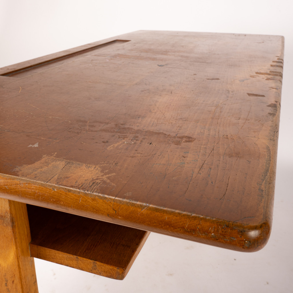 Vintage wooden school desk made of solid beech wood, varnished and stained in honey shade. Under the worktop there is a storage space and a on the top a groove for pencils. One of the legs bears a metal hook for a school bag, a number and a sticker.