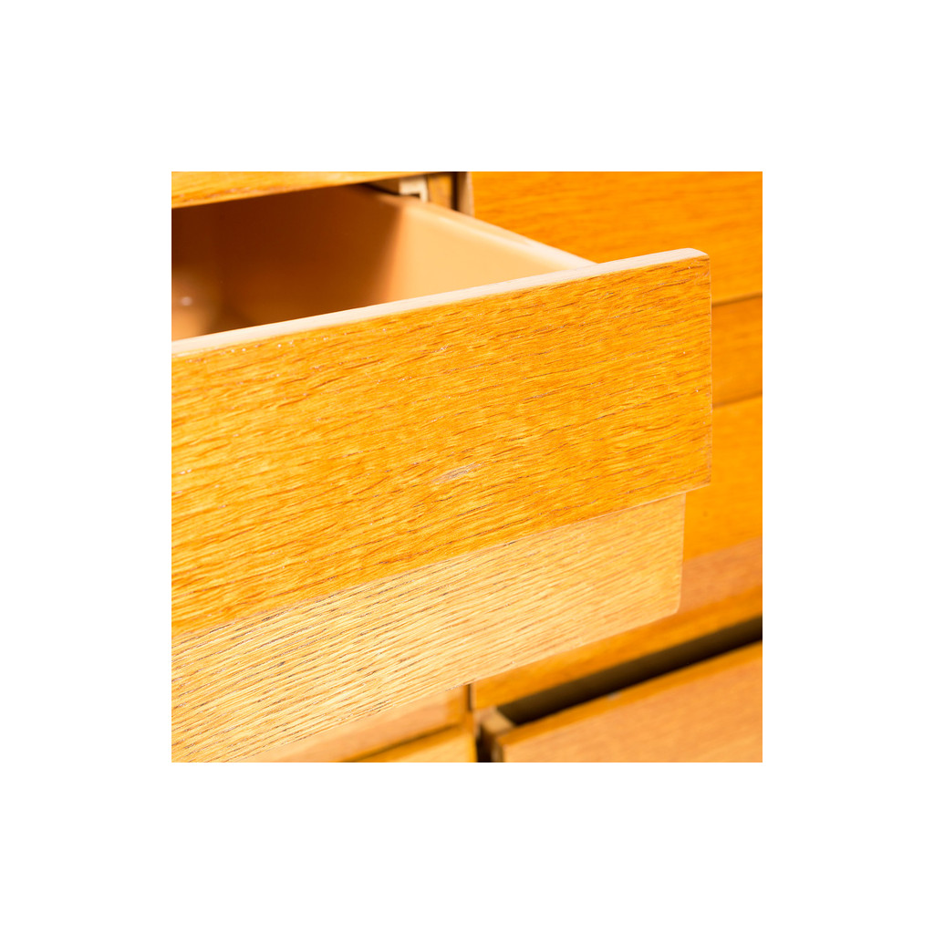 The U-453 cabinet is suitable for any room, it is compact and relatively light, so it is easy to handle. The cabinet has eight drawers and a veneered (oak) finish. The base is solid spruce. We have consulted Jiří Jiroutek, from whom we also have the exclusive right to renew the production of the entire U-450 series since 2018.
