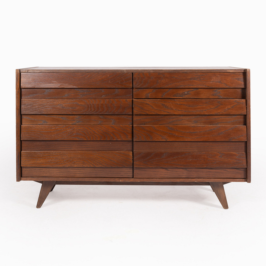 The U-453 cabinet is suitable for any room, it is compact and relatively light, so it is easy to handle. The cabinet has eight drawers and a veneered (oak) finish. The base is solid spruce. We have consulted Jiří Jiroutek, from whom we also have the exclusive right to renew the production of the entire U-450 series since 2018.