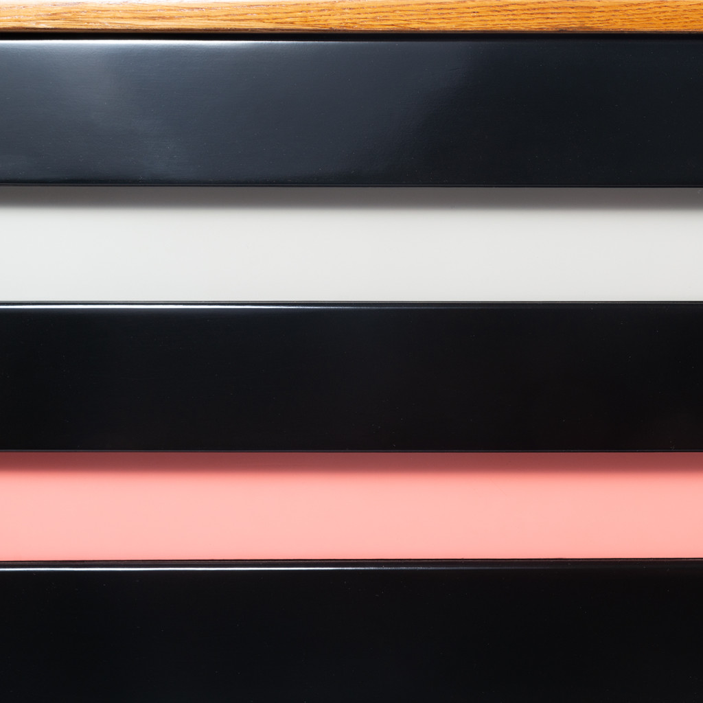 The U-453 cabinet is suitable for any room, it is compact and relatively light, so it is easy to handle. The cabinet has eight drawers in grey and pastel pink with black handles and a veneered (oak) finish. The base is solid spruce. We have consulted Jiří Jiroutek, from whom we also have the exclusive right to renew the production of the entire U-450 series since 2018.