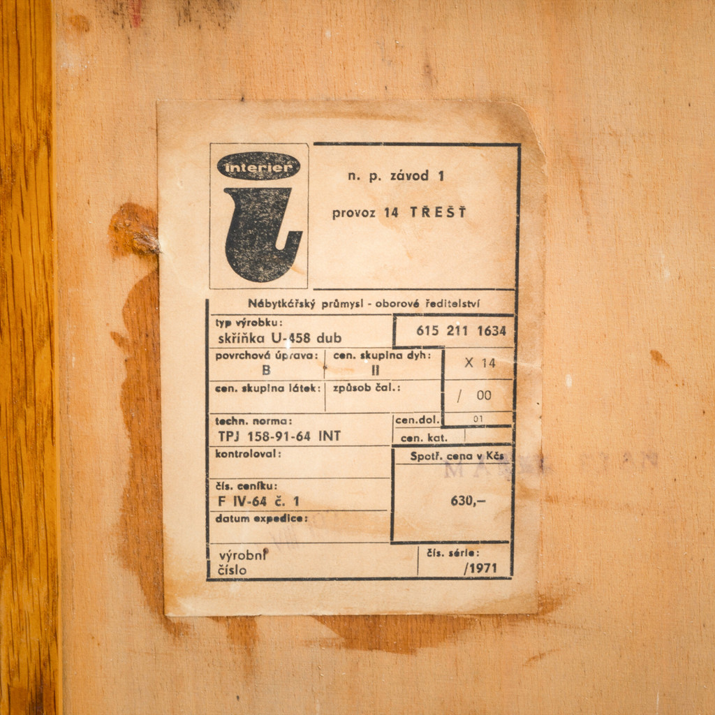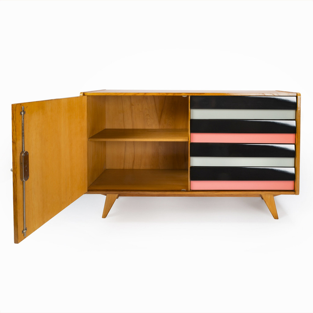 The U-458 is suitable for any room. It is compact and relatively light, making it easy to handle. It is divided into a storage section with a lengthwise shelf and a section with four drawers in grey and pastel pink with black handles. The cabinet has a veneered (oak) surface and a solid wood base. We have consulted Jiří Jiroutek, from whom we also have the exclusive right to renew the production of the entire U-450 series from 2018.