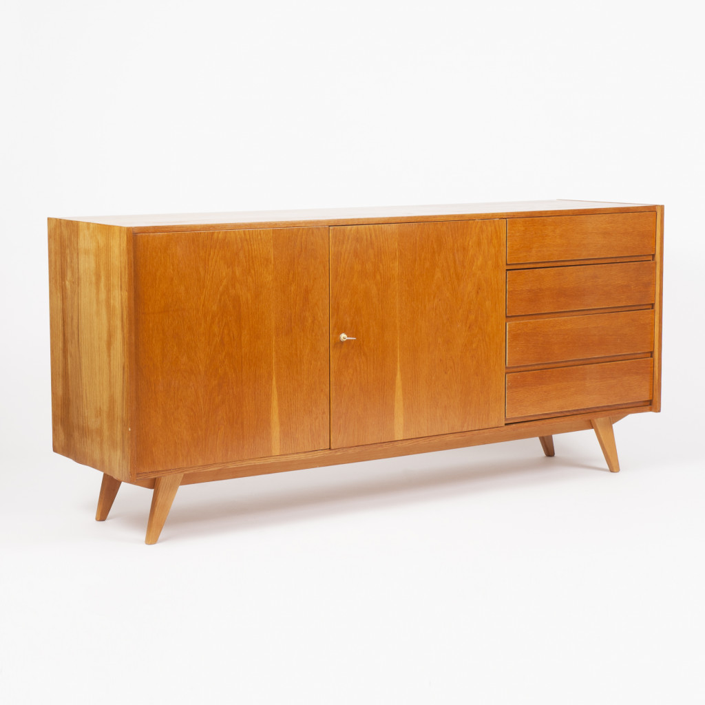 The U-460 is suitable for any room. It is compact and relatively light, making it easy to handle. It is divided into a storage section with a lengthwise shelf and a section with four drawers. The cabinet has a veneered (oak) surface and a solid wood base. We have consulted Jiří Jiroutek, from whom we also have the exclusive right to renew the production of the entire U-450 series from 2018.