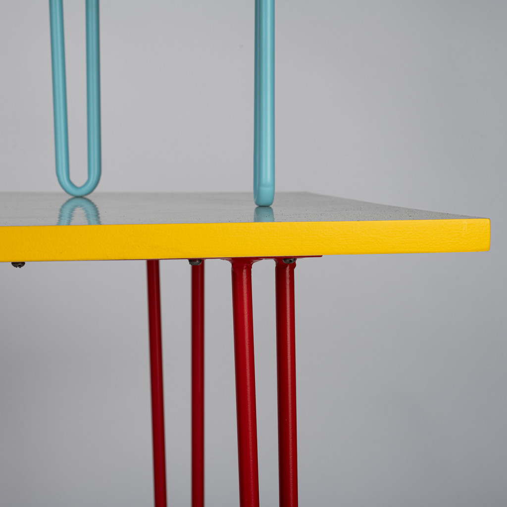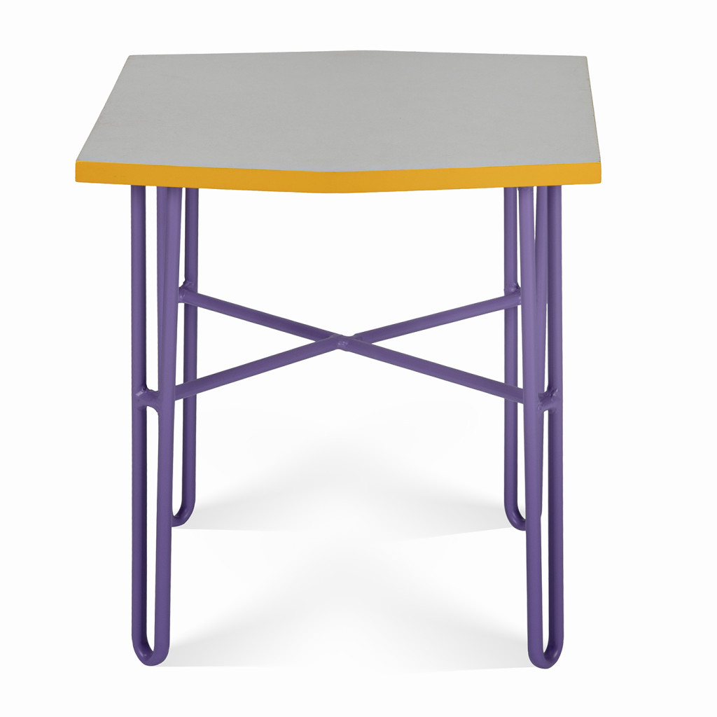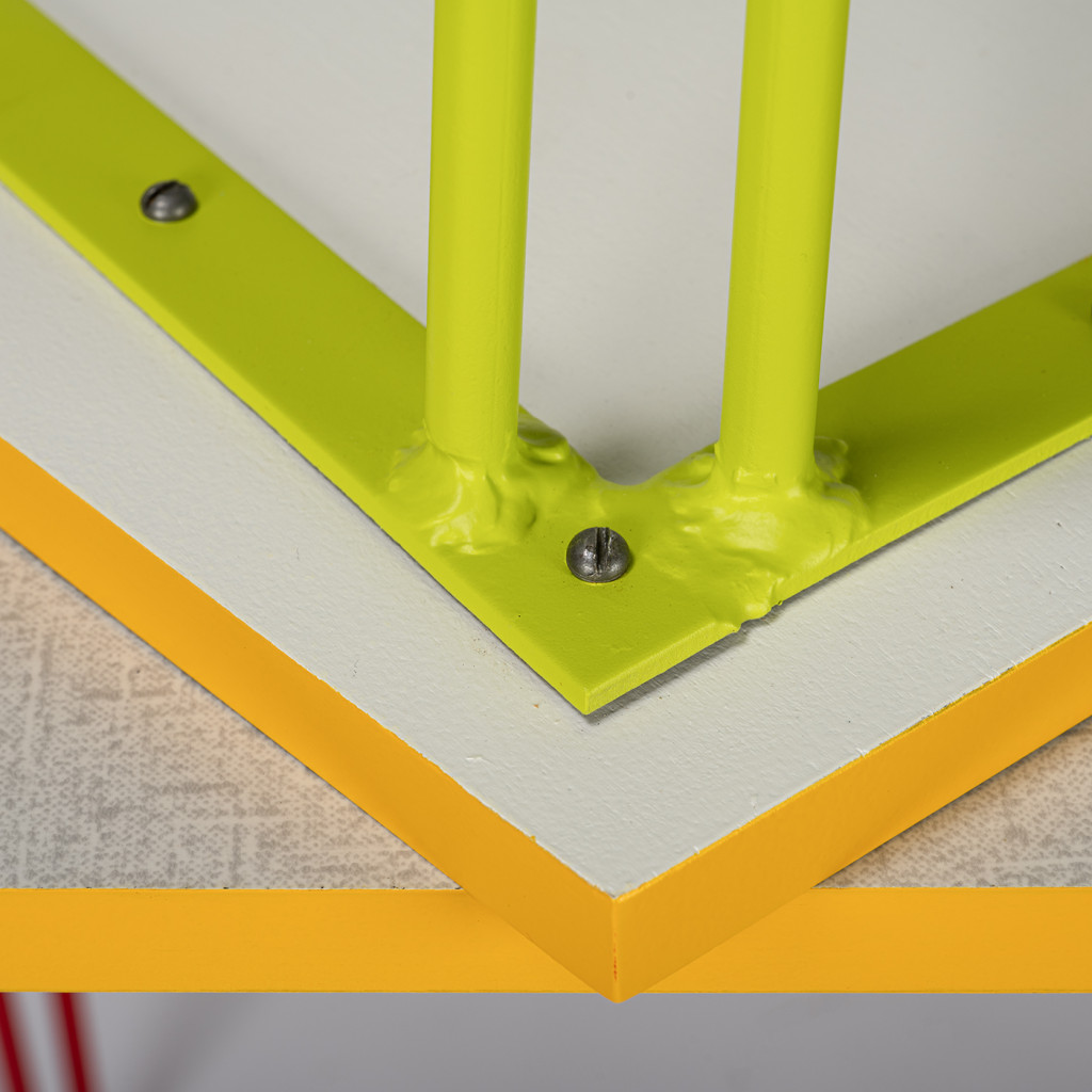 The tops have a slightly asymmetrical shape and are made of a combination of plywood and umacart (paper composite panels) in a white-grey shade with yellow trim. They rest on tall legs made of bent steel with a cross design. The table legs are painted red, the chair legs purple, orange, light blue and light green.