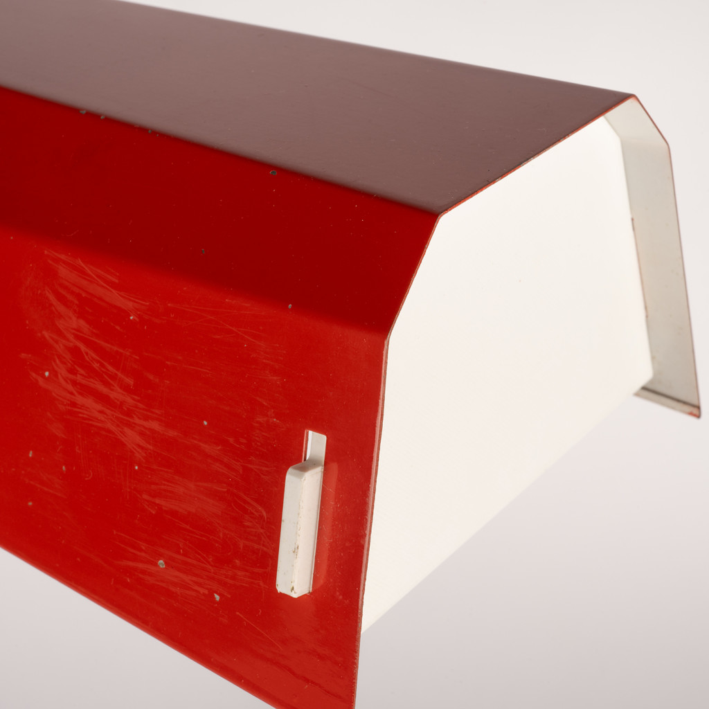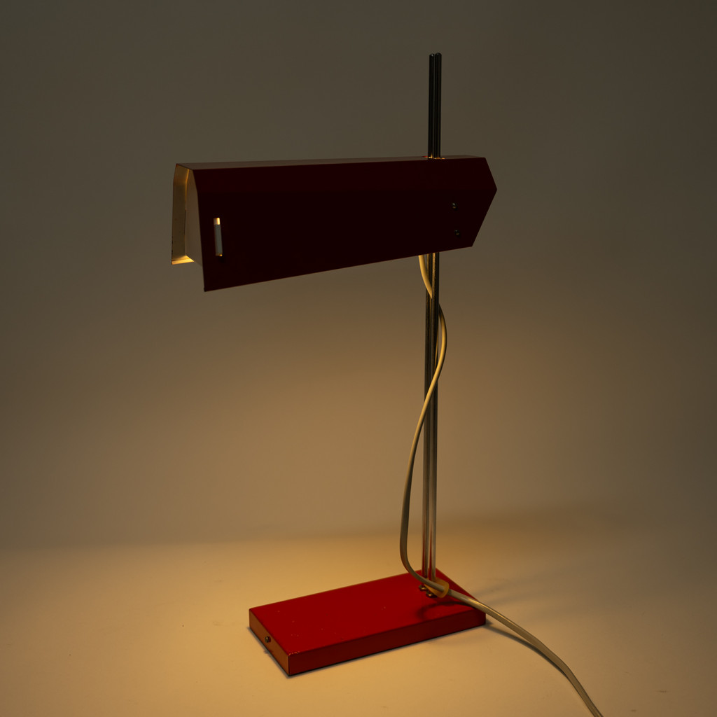 This lamp features a chrome-plated steel leg and a deep red, square steel shade with an adjustable height. It lights up with one E27 bulb.