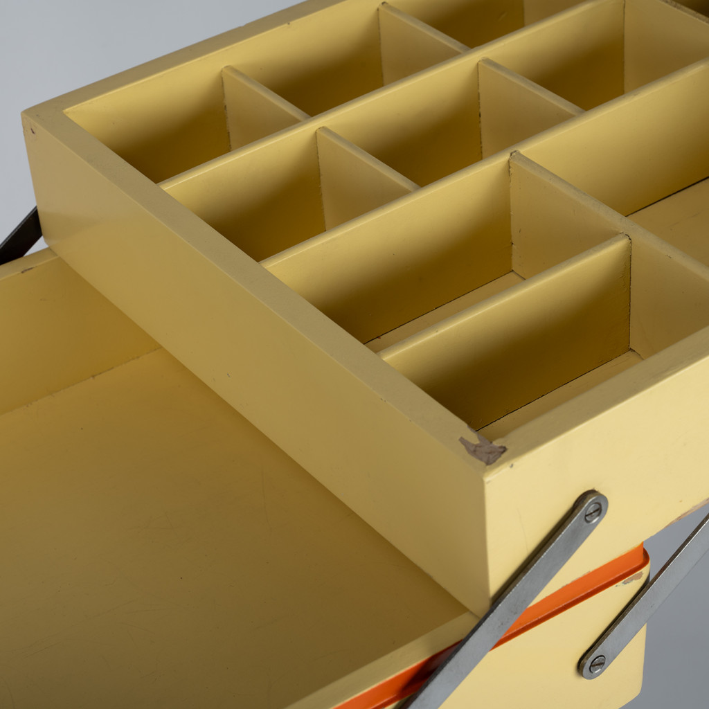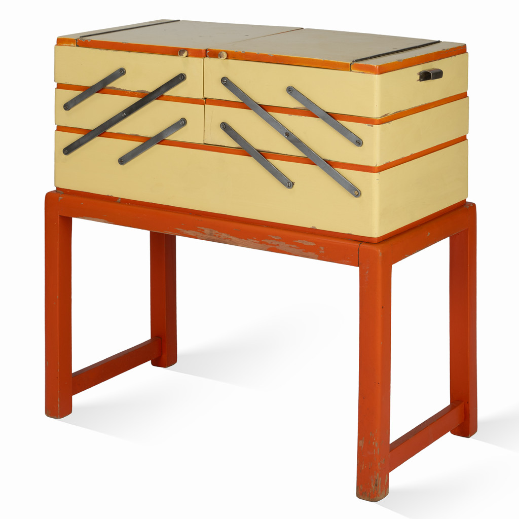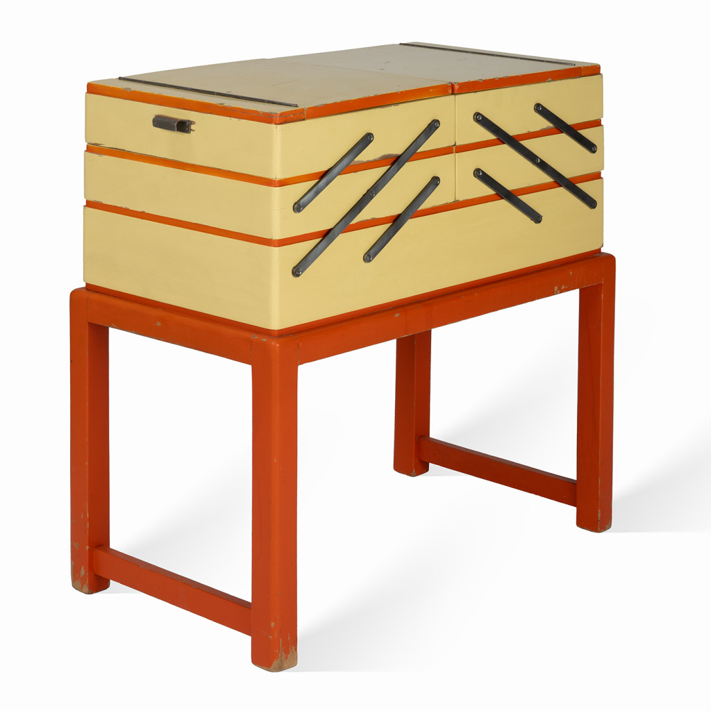 This original Art Deco sewing cabinet features a classic side-hinged mechanism and offers three levels of storage compartments. It is made from a combination of solid beech wood and plywood, and it stands on a solid steel structure with a deep orange enamel finish. The body of the cabinet is decorated with vanilla enamel and orange trim, and has metal hinges.