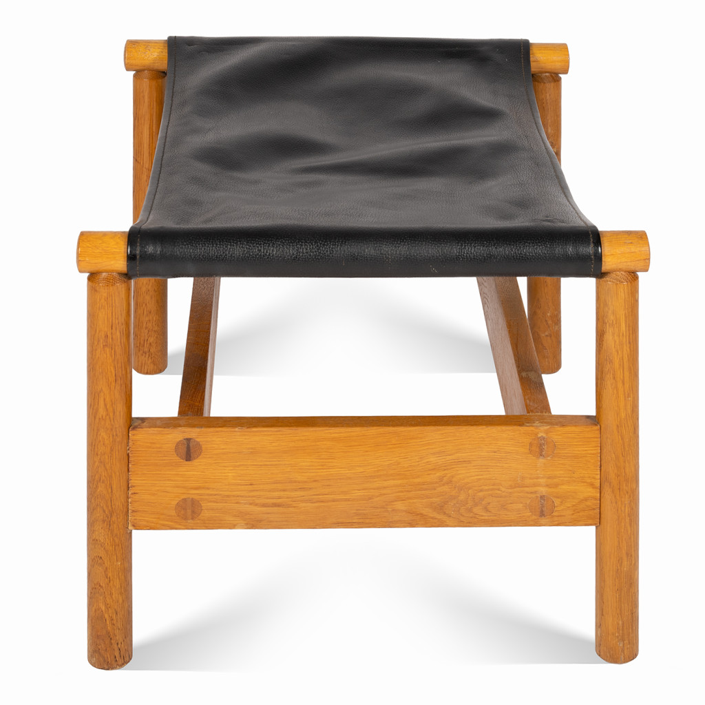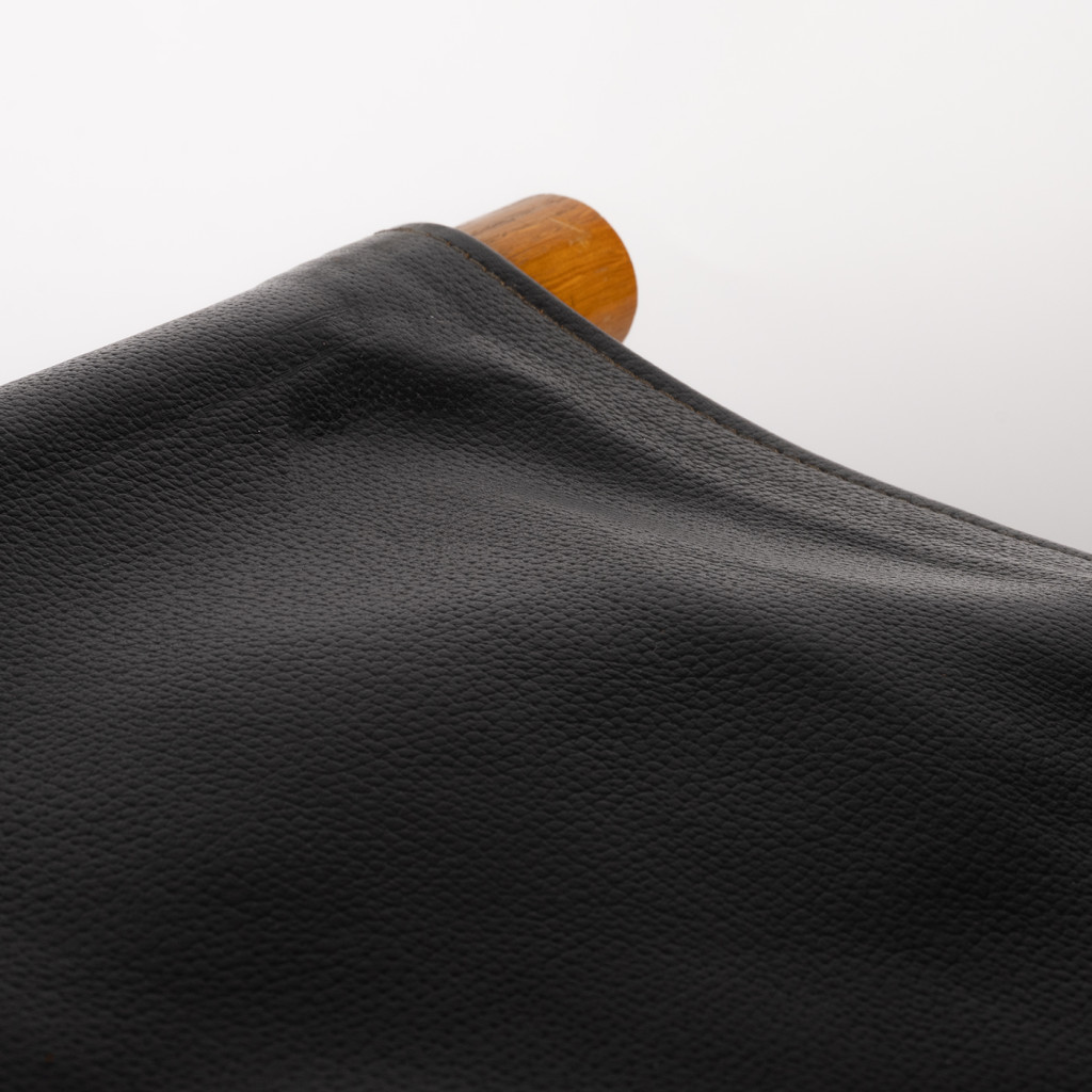 Wooden footstool, probably from the 1960s. It has a solid beech wood frame covered with firm black leather.