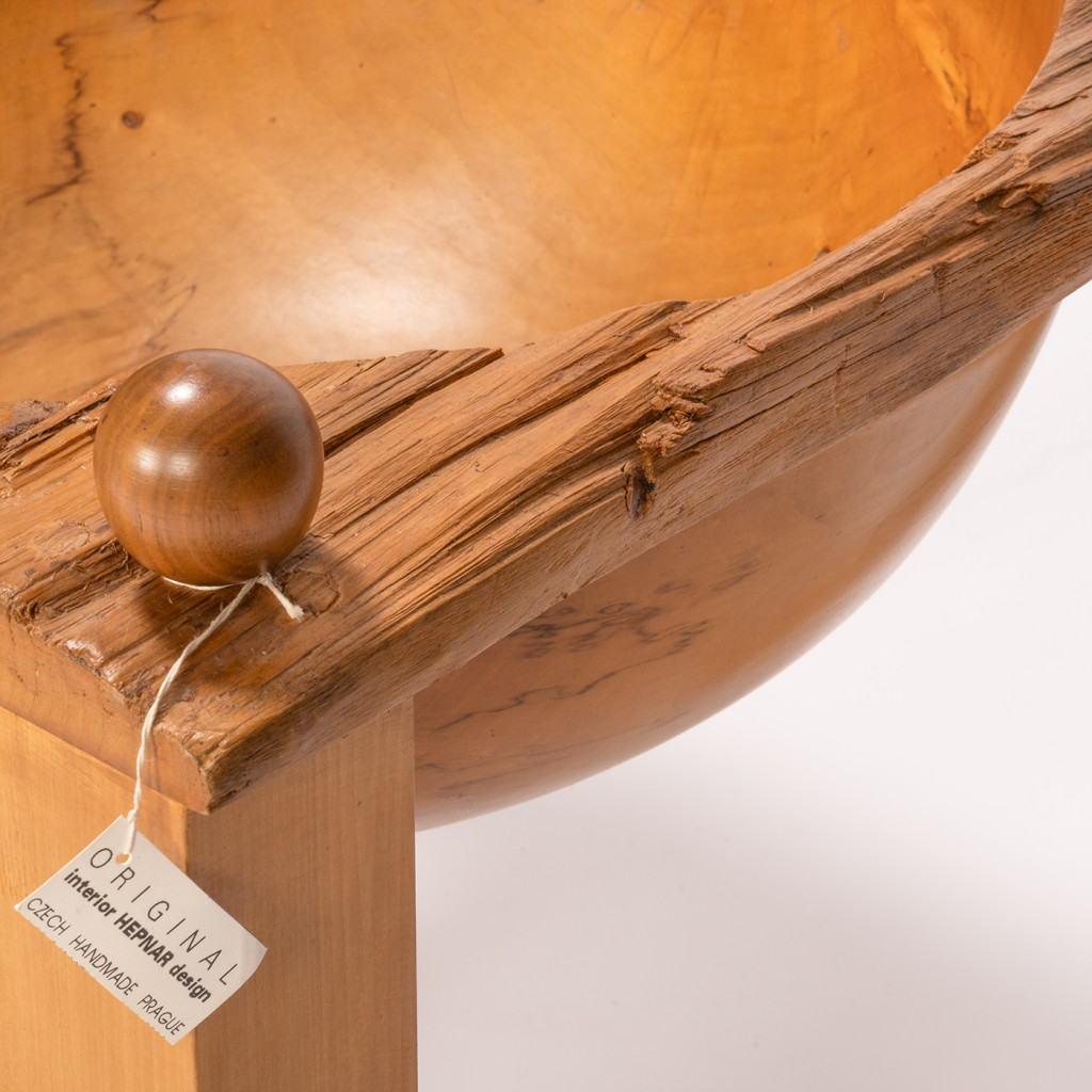 This unique wooden table was designed and crafted by Antonín Hepnar, a Czech artist also known as the master of woodturning. Hepnar developed his love of craftsmanship and woodworking as a child in his father's workshop. He further honed his woodturning skills and sense of materials at the Secondary School of Arts and Crafts in Prague's Žižkov district. His final school project was the now iconic Amanita lamp. Fifty-seven years later, in 2010, Hepnar won the main prize at the Designblok show. Hepnar became famous for his unique lamps, which bore his unmistakable signature, and he produced and hand-painted his designs himself. His favourite wood to work with was hardwood from deciduous trees. It is said that he made each design in no more than five pieces.