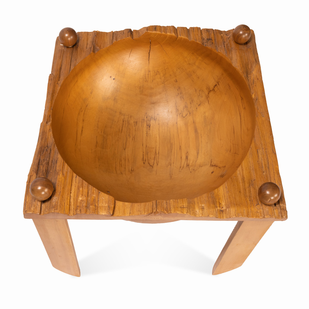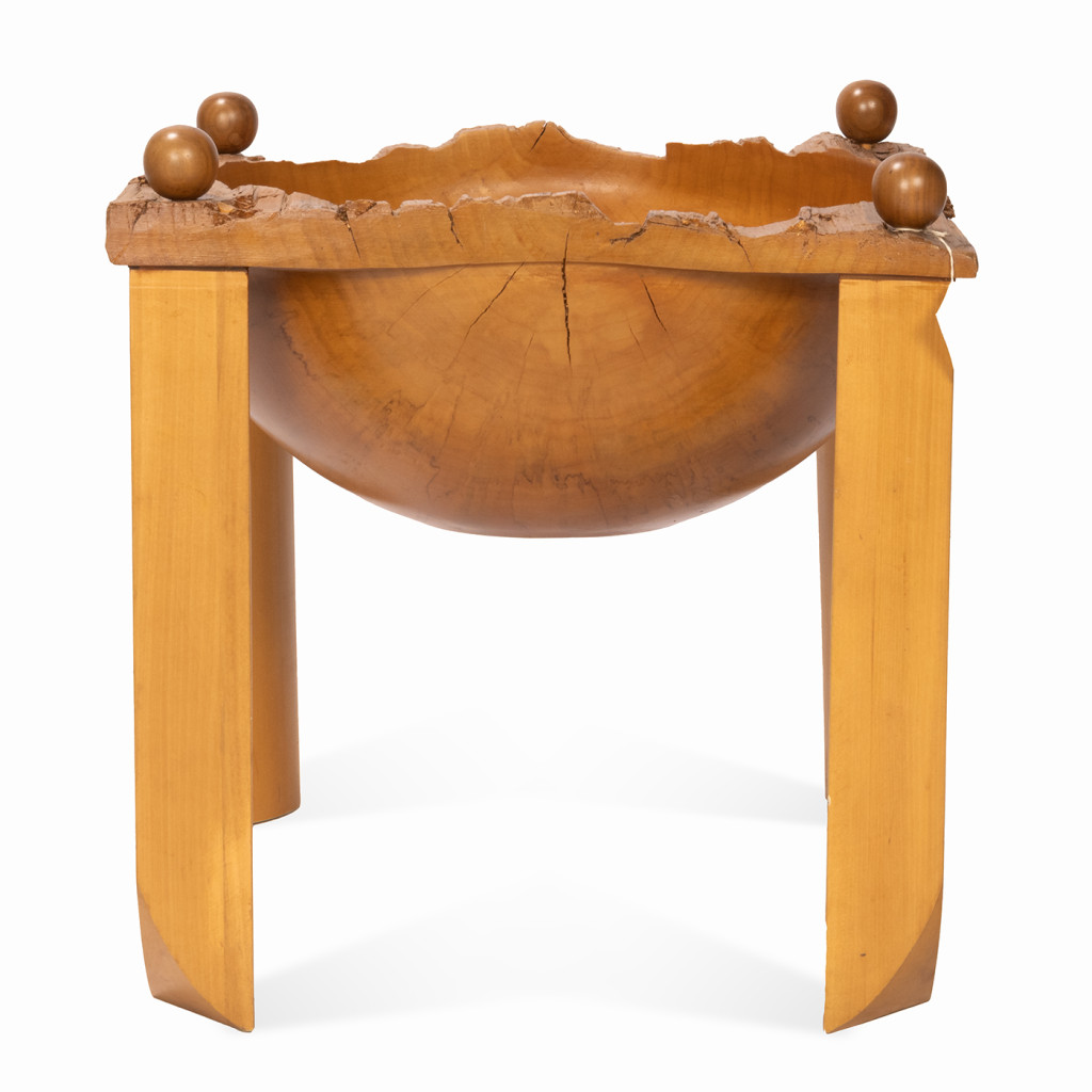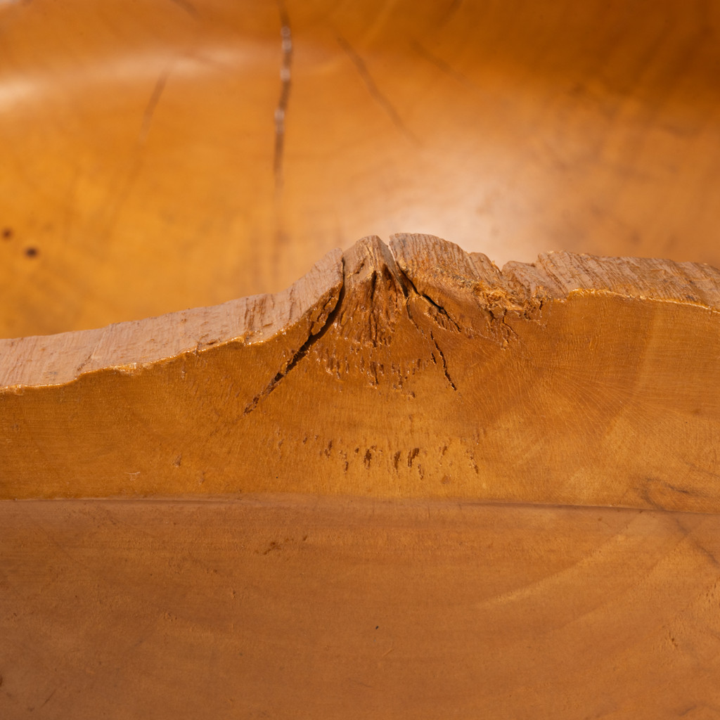 The wooden table consists of a bowl hollowed out of honey-colored linden wood and four short triangular legs with cut tips. The table is based on the contrast between raw and processed material. The edges of the tabletop are intentionally left unfinished and complemented by four turned balls in the corners. The bottom of the bowl hides a beautiful wood grain.