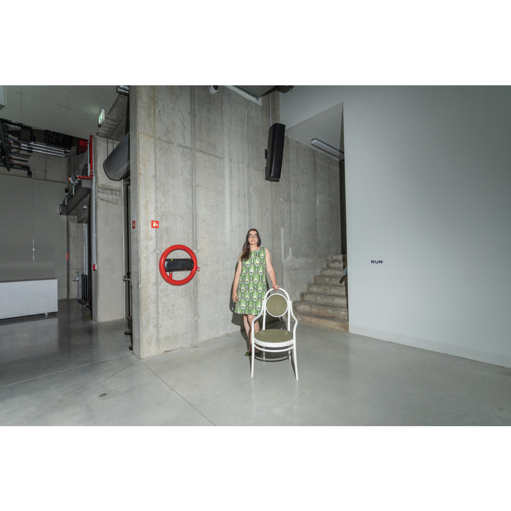 The wooden chair with corduroy cover was made in the 1980s according to a design by Zbyněk Hřivnáč for the Zlatá Praha restaurant of the Intercontinental Hotel in 1986.
