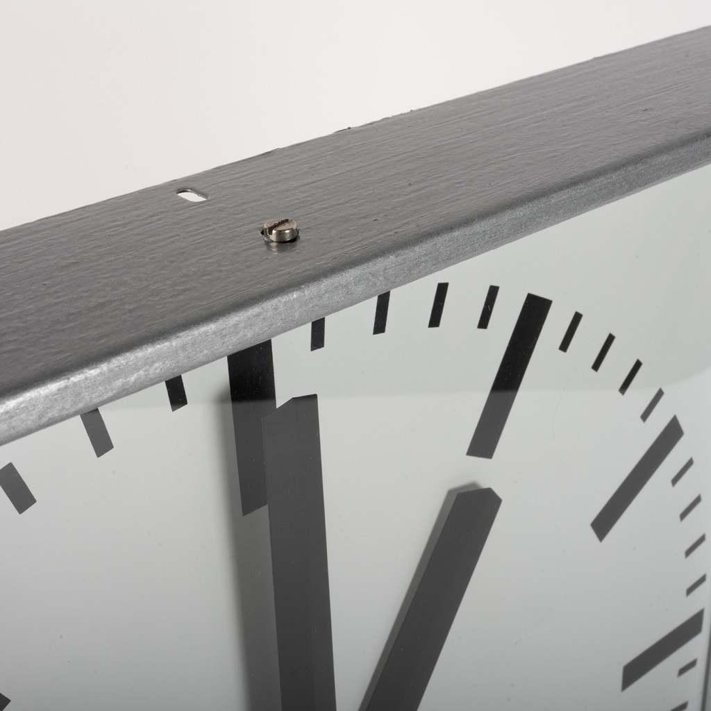 Rám hodin je z ocelového plechu natřeného stříbrošedou kladívkovou barvou.