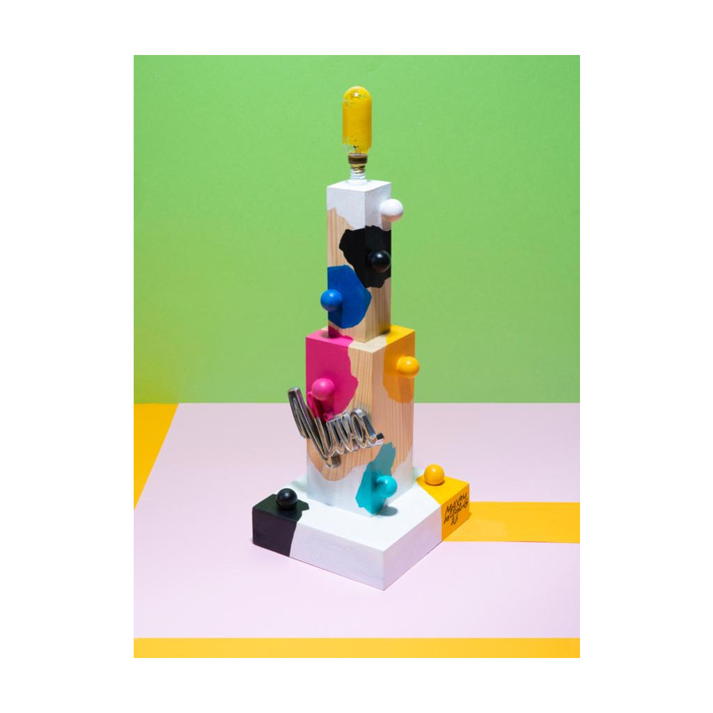 Maxim Velčovský's objects for Picky Parents are composed of various objects in three-dimensional collages. The artist creates surreal still lifes or totems on the theme of play and light. The first object, "Viva la luce!", is a monument to the light parents use to help their children fall asleep.