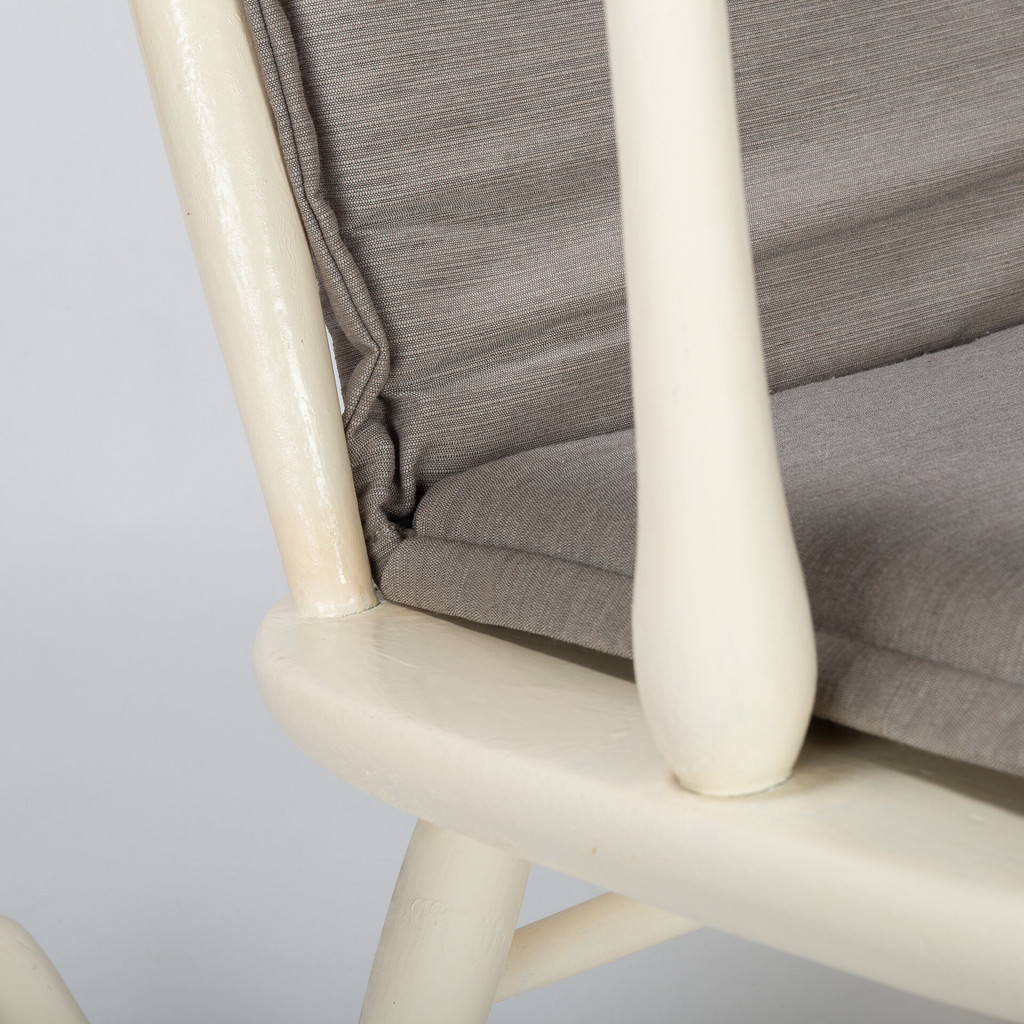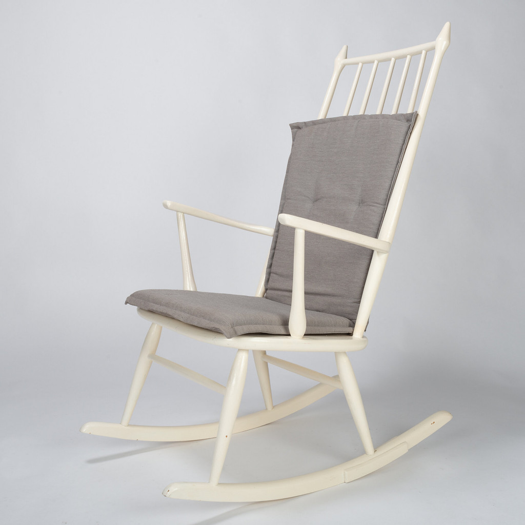 Rocking chair made in Finland in the 1960s. The chair is inspired by the design of Lena Larsson and Ilmara Tapiovaara. Its construction is made of wood and painted white. The right leg of the chair is reinforced with a wooden slat painted white. These rocking chairs are still found in many homes and are a desirable product for those looking for a quality and stylish piece of furniture.