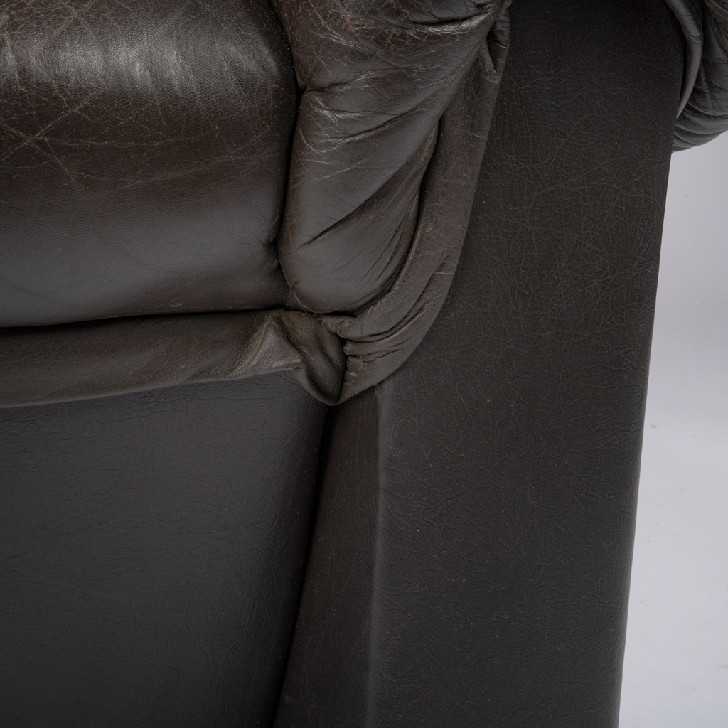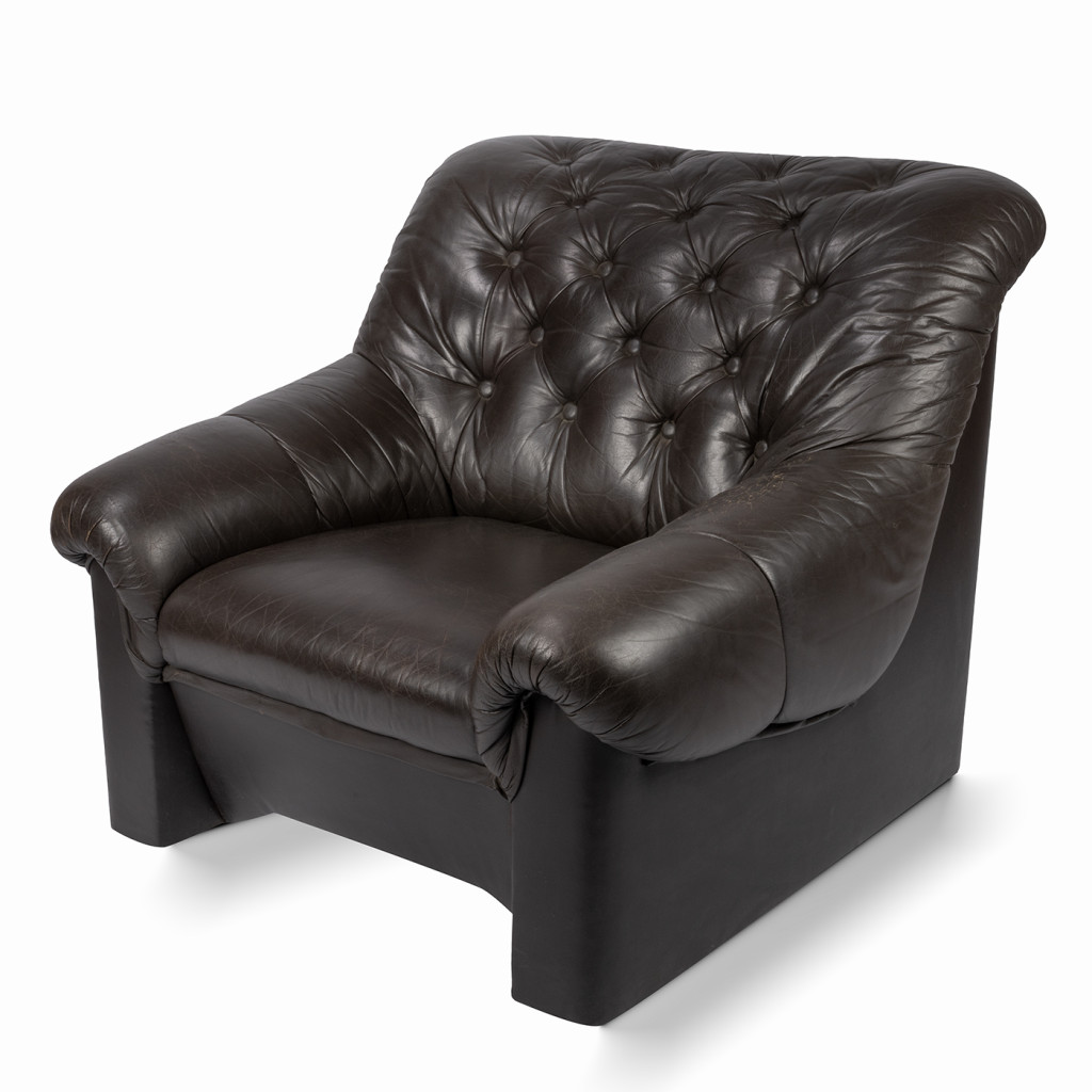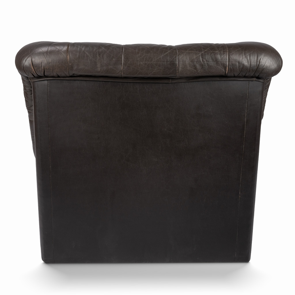 Velmi pohodlné robustní křeslo z kůže v tmavě hnědém odstínu. Křeslo má pevnou čtvercovou konstrukci a opěradlo zdobí výrazné prošívání s knoflíky.