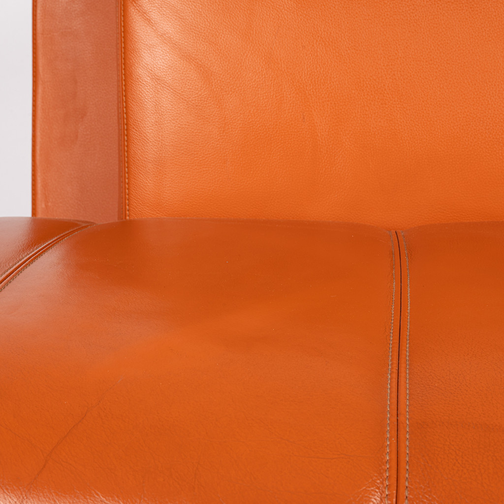 Křeslo stojí na čtyřech tenkých nožkách z chromované oceli spojených obloukovou příčkou. Tělo křesla tvoří robustní pevná obdélníková záda, menší opěradlo a podlouhlý sedák, vše polstrované měkkou prošívanou kůží v sytě oranžovém odstínu. Křeslo je ponecháno ve skvělém původním stavu, má pevnou konstrukci a bylo důkladně vyčištěno. Kožené polstrování má místy drobné flíčky a kovová podnož je lehce poškrábaná, jak je viditelné na fotografiích.