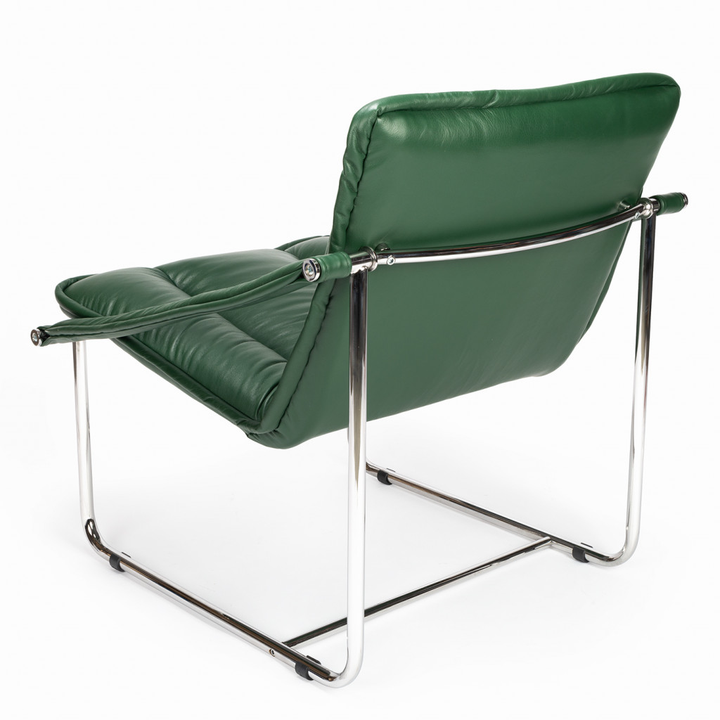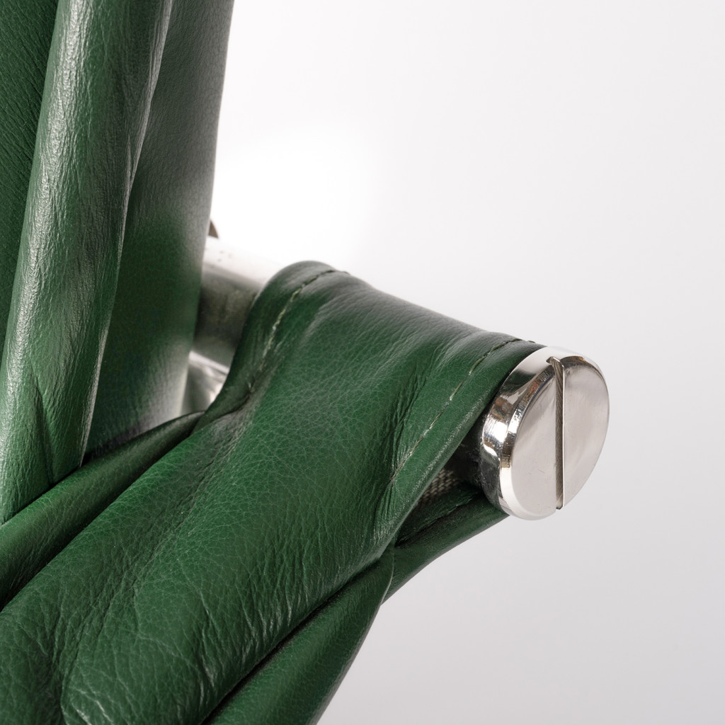Tato replika křesla má kovový chromovaný rám a kožené čalounění. Tento specifický design byl vyroben pouze pro Novou scénu Národního divadla.