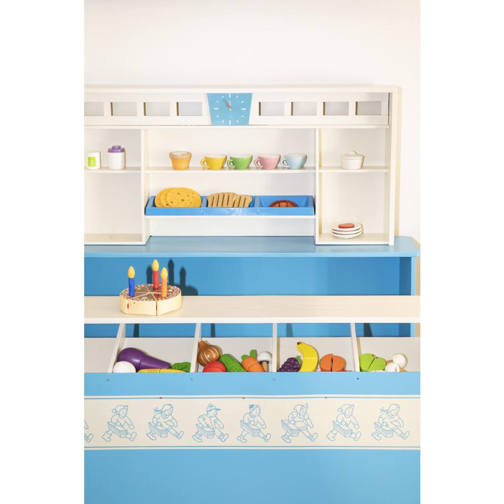 Dřevěný pult je zhotovený ze smrkového masivu, polotvrdé dřevovláknité desky (MDF) a plastových prvků. Je natřený kombinací blankytně modré a krémové barvy a lze ho rozložit na dvě větší části. První, vyšší pult nese nástavbu s poličkami a hodinami. Druhý, nižší pult má přihrádky a je ozdoben pásem s obrázky dětí, které nakupují.
