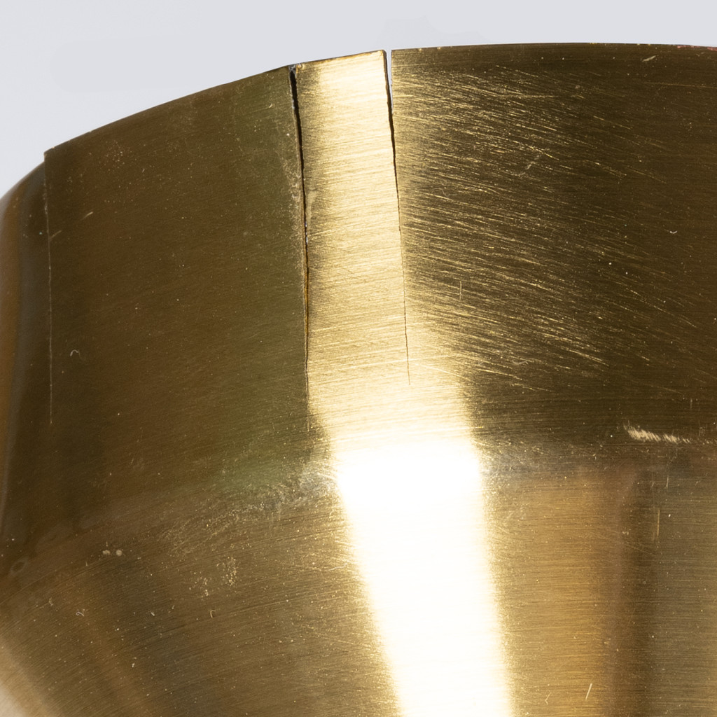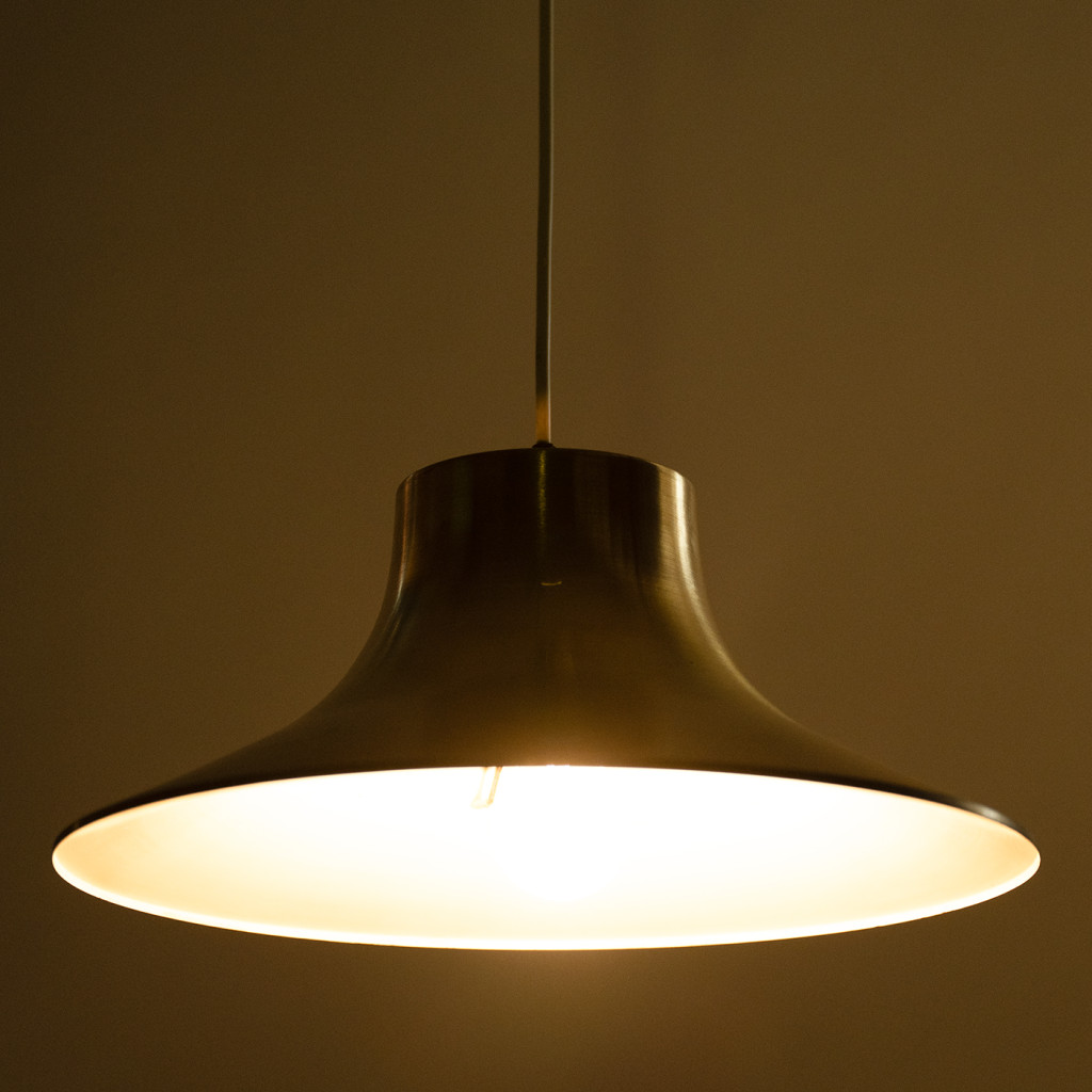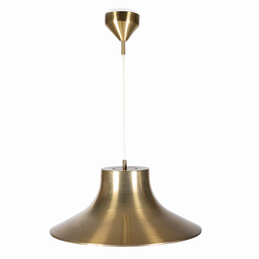 Mosazný lustr navržený v kontextu dobového stylu 70. let zvaného Space Age, který do estetiky užitého designu přinesl oblé futuristické linie. Houbovitý tvar stínidel je pro tuto dobu velmi typický.