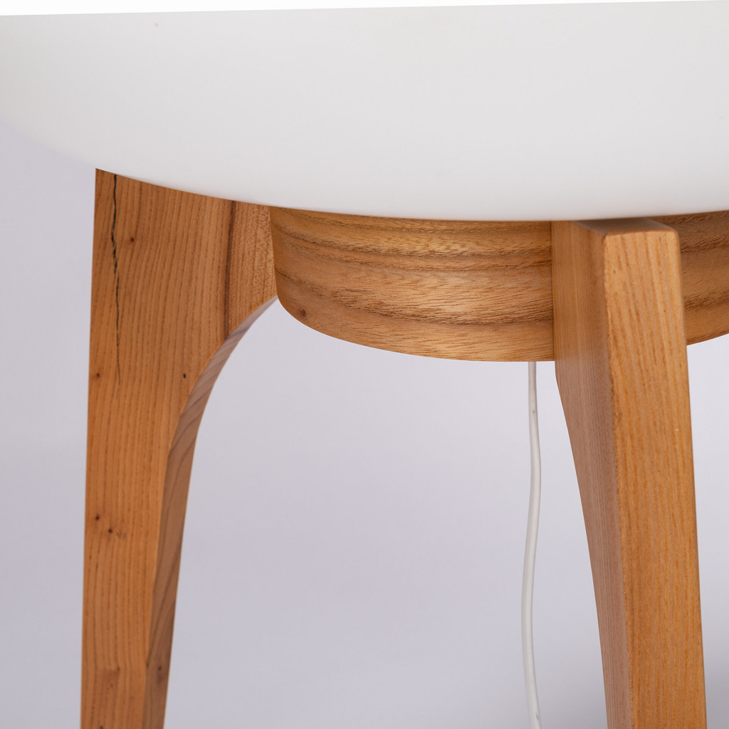 Podlahová lampa z šedesátých let vyrobená podnikem ÚLUV, tedy Ústředím lidové umělecké výroby, který vznikl v roce 1948 sdružením několika značek včetně známé Krásné jizby. Pražský podnik ÚLUV měl výrobnu v Uherském Hradišti s podnikovou prodejnou v domě na Palacké v Uherském Hradišti, která zde fungovala až do poloviny devadesátých let. Lampa je sestavena z dřevěné trojnožky, ve které je zabudovaný závit pro žárovku. Do trojnožky se nasazuje stínidlo oválného tvaru z mléčného skla, které vytváří příjemně rozptýlené světlo. Lampa je ve výborném původním stavu s minimálními známkami používání. 250 V / 100 W