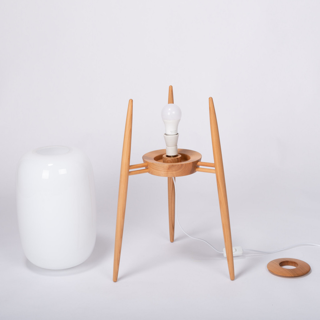 Lampa je kompletně ručně vyrobena v České republice z třešňového dřeva a foukaného mléčného skla. Skládá se z dřevěné trojnožky, ve které je zabudovaný závit pro žárovku. Do trojnožky se nasazuje stínidlo oválného tvaru z mléčného skla, které vytváří příjemně rozptýlené světlo.