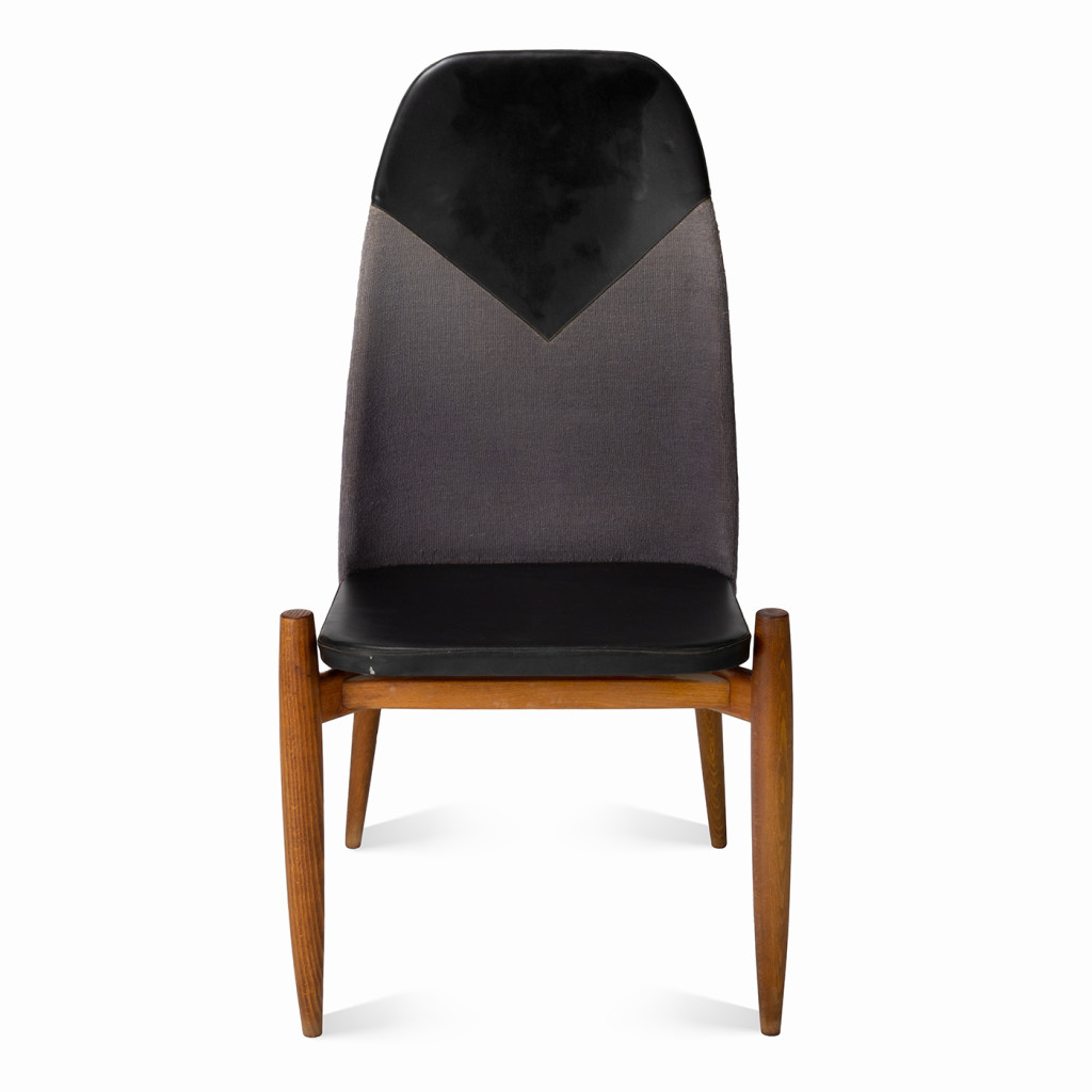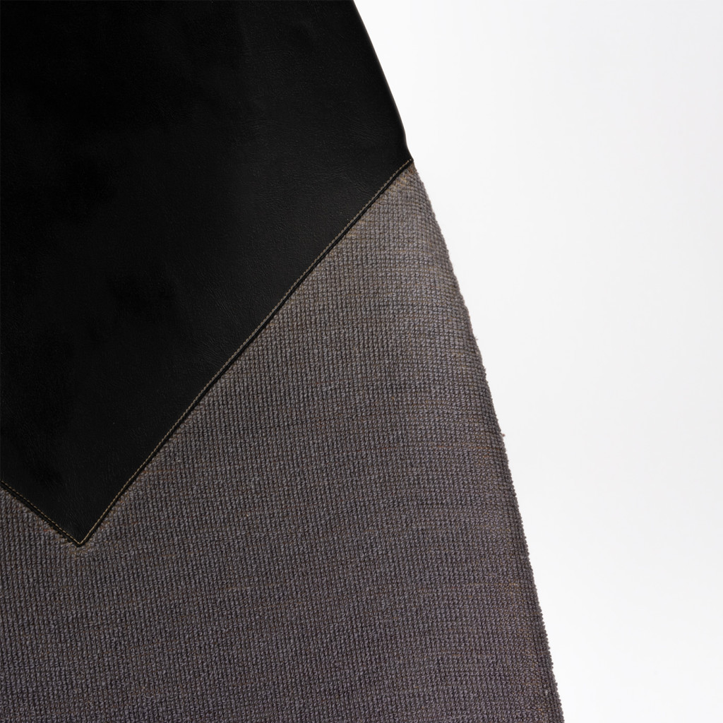 Jídelní židle je vyrobena z bukového dřeva. Sedák a opěrák je čalouněn šedou látkou a vrchní část opěráku má vložený klín z černé kůoženky. Zadní část podnože přesahuje až do části zádové opěrky, kde je zakončena mosazným detailem.