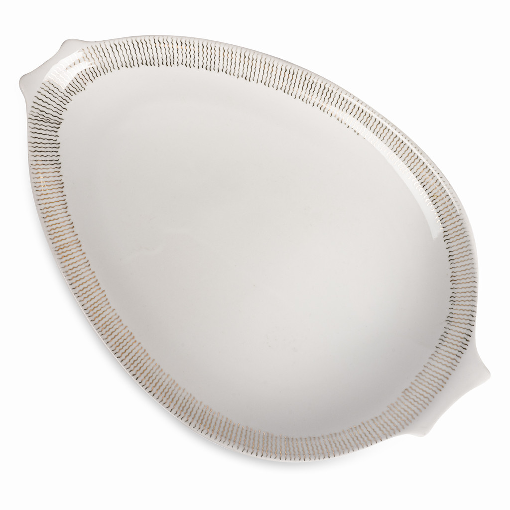 Tento tác má asymetrický oválný tvar a jeho kraj lemuje dekorativní motiv drobných zlatých vlnovek. Tác je ve výborném původním stavu, spodní okraj má lehkou patinu.