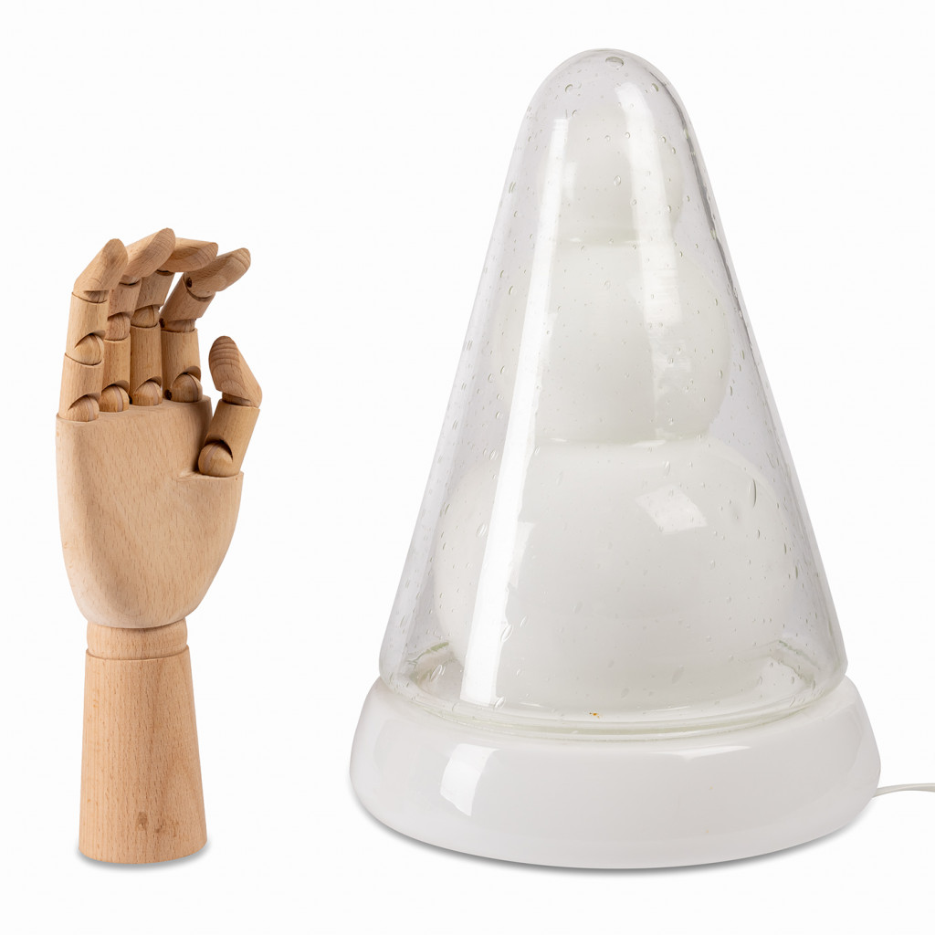 Atypická stolní lampička vyrobená z několika vrstev skla. Tvarovaný vnitřní díl z mléčného skla je krytý zakulaceným jehlanem, který je vyrobený z čirého skla se zatavenými bublinkami. Po rozsvícení mléčné sklo vytváří příjemné rozptýlené světlo a zároveň vynikne tvar vnitřního dílu. Lampa je zcela funkční, ponechána v původním stavu.