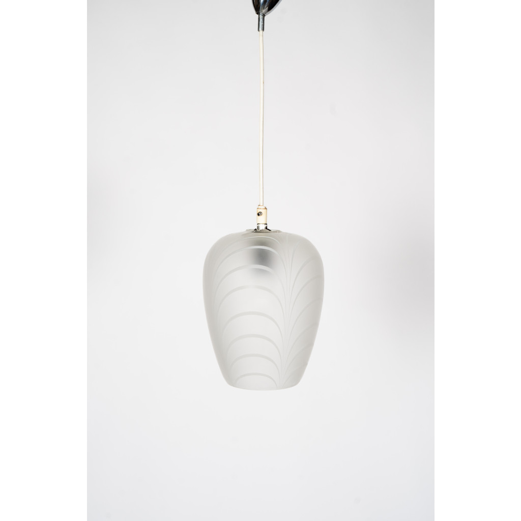 Lustr z matného průhledného skla vyrobený v 70. letech. Stínidlo ve tvaru poupěte zdobí motiv oblých linek z mléčného skla. Visí na gumovém kabelu s kovovým kuželovitým zakončením a gumovým těsněním.